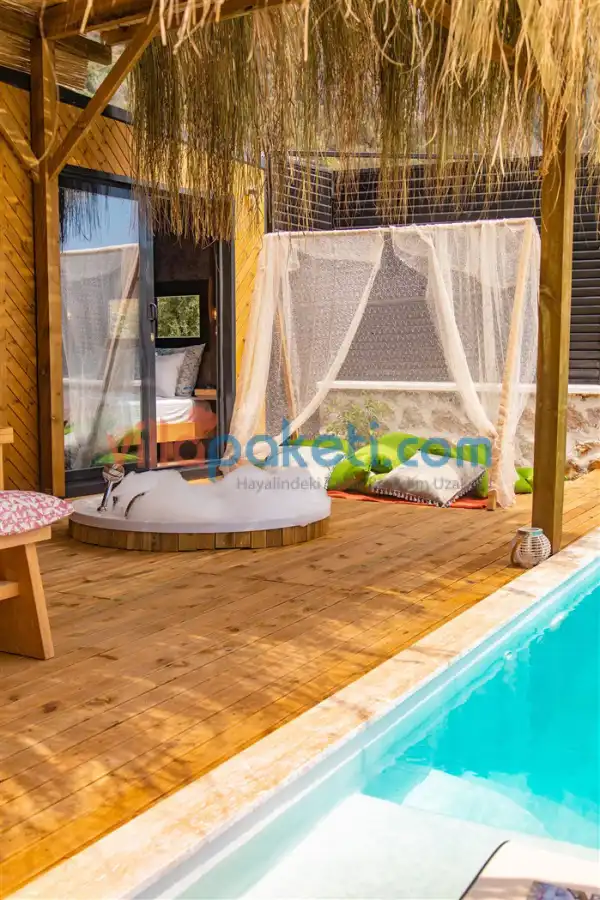 Tiny Dream House Kalkan Akbel mevkiinde yer almaktadır. 1 yatak odalı olup 2 kişi konaklama kapasitesine sahiptir. Mavinin büyüsünün hakim olduğu Tiny houseun havuz terasında, yılın stresinden arınacağınız jakuzi bulunmaktadır. Modern ve şık dizaynı ile son zamanlarda balayı çiftlerinin gözdesi haline gelmiştir. Sonsuzluk havuzu ile Tiny Dream House siz değerli misafirlerimizi de bekliyor ! Şimdiden iyi tatiller dileriz.