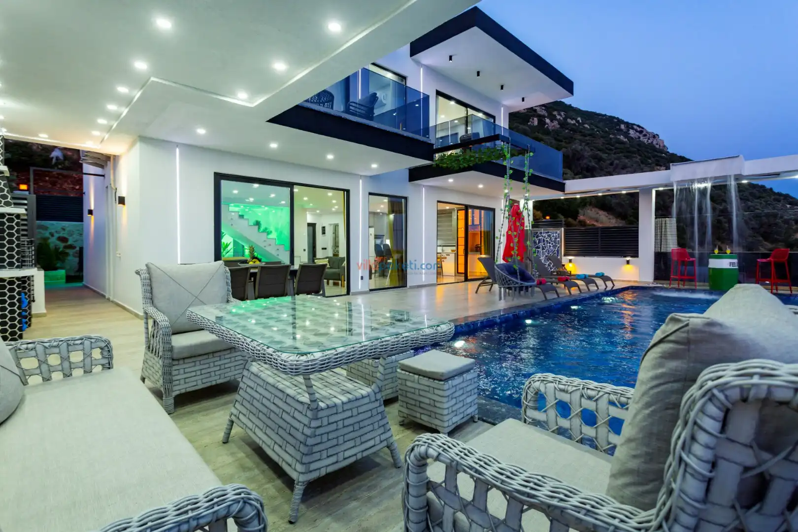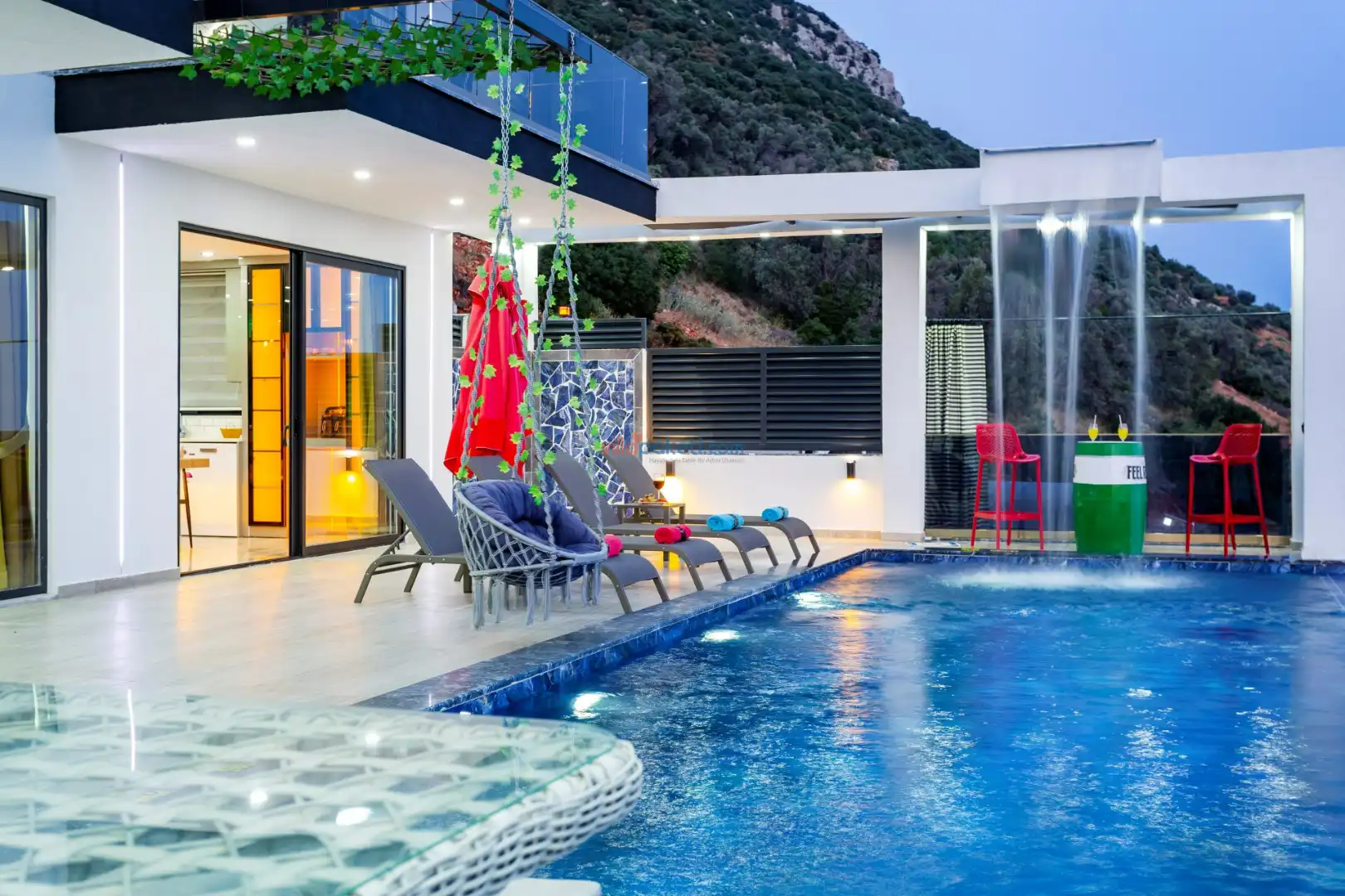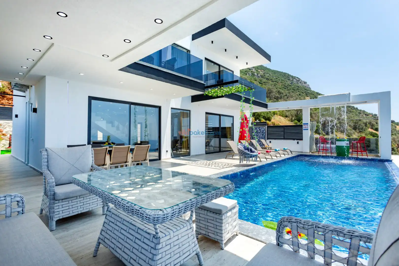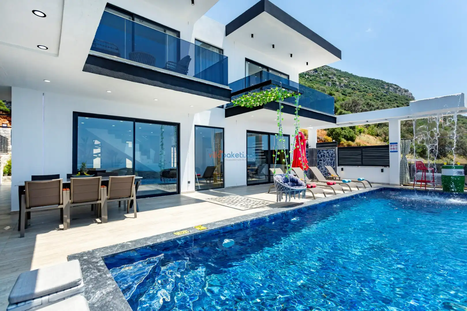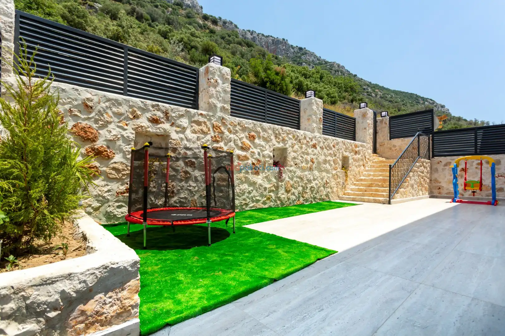 Villanın açık alanının arka tarafında çocuklar için kaydırak ve trambolin bulunur. Havuzun bulunduğu ön tarafta ise ferah bir oturma alanı, yemek masası, şelale gibi detaylar yer alır. Havuz terası gün boyunca güneş alır. Üstelik gün batımı için harika bir seyir terası olma özelliği taşır.