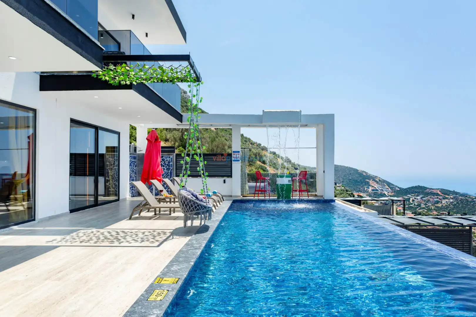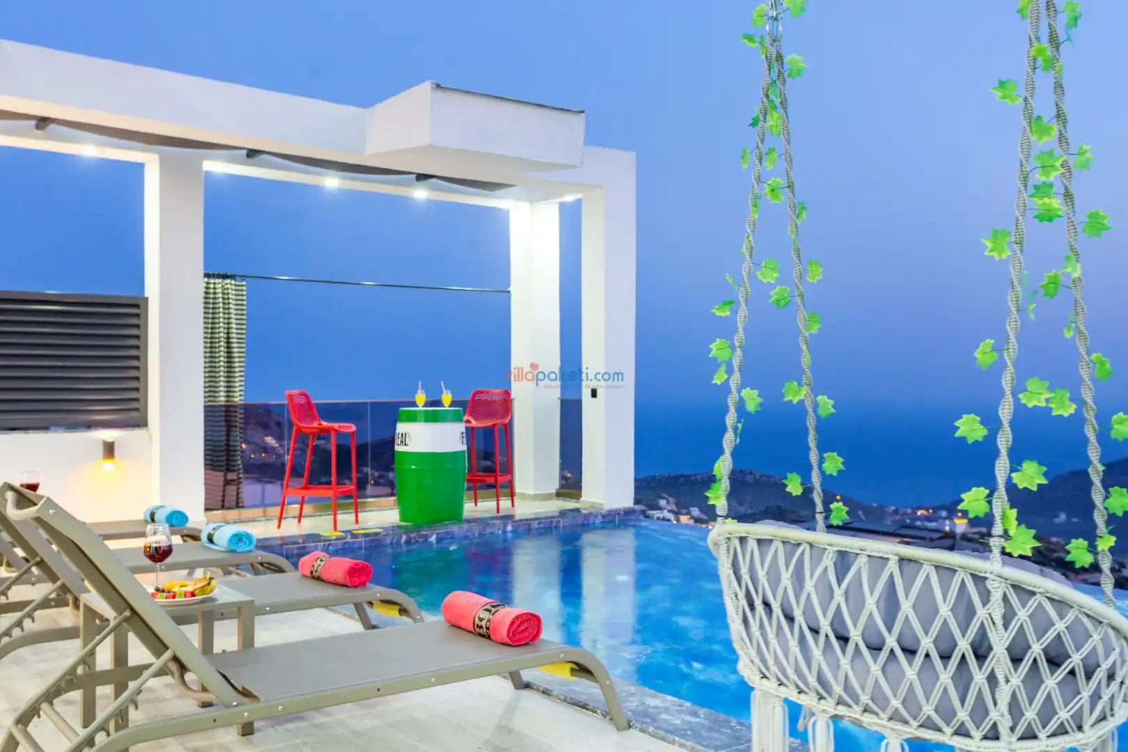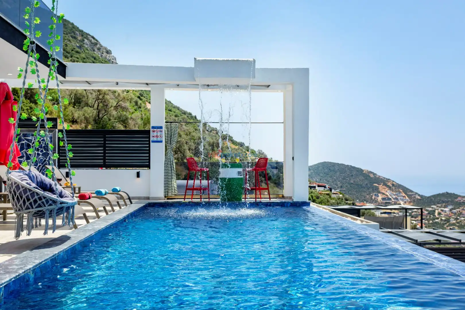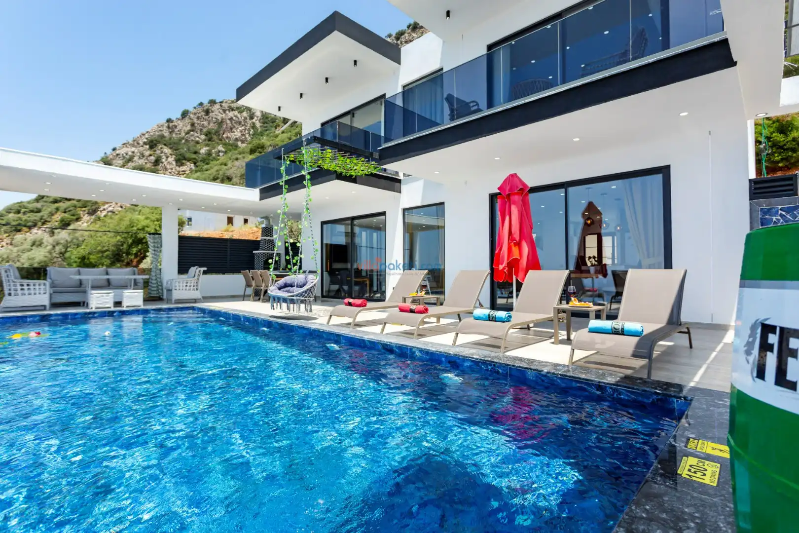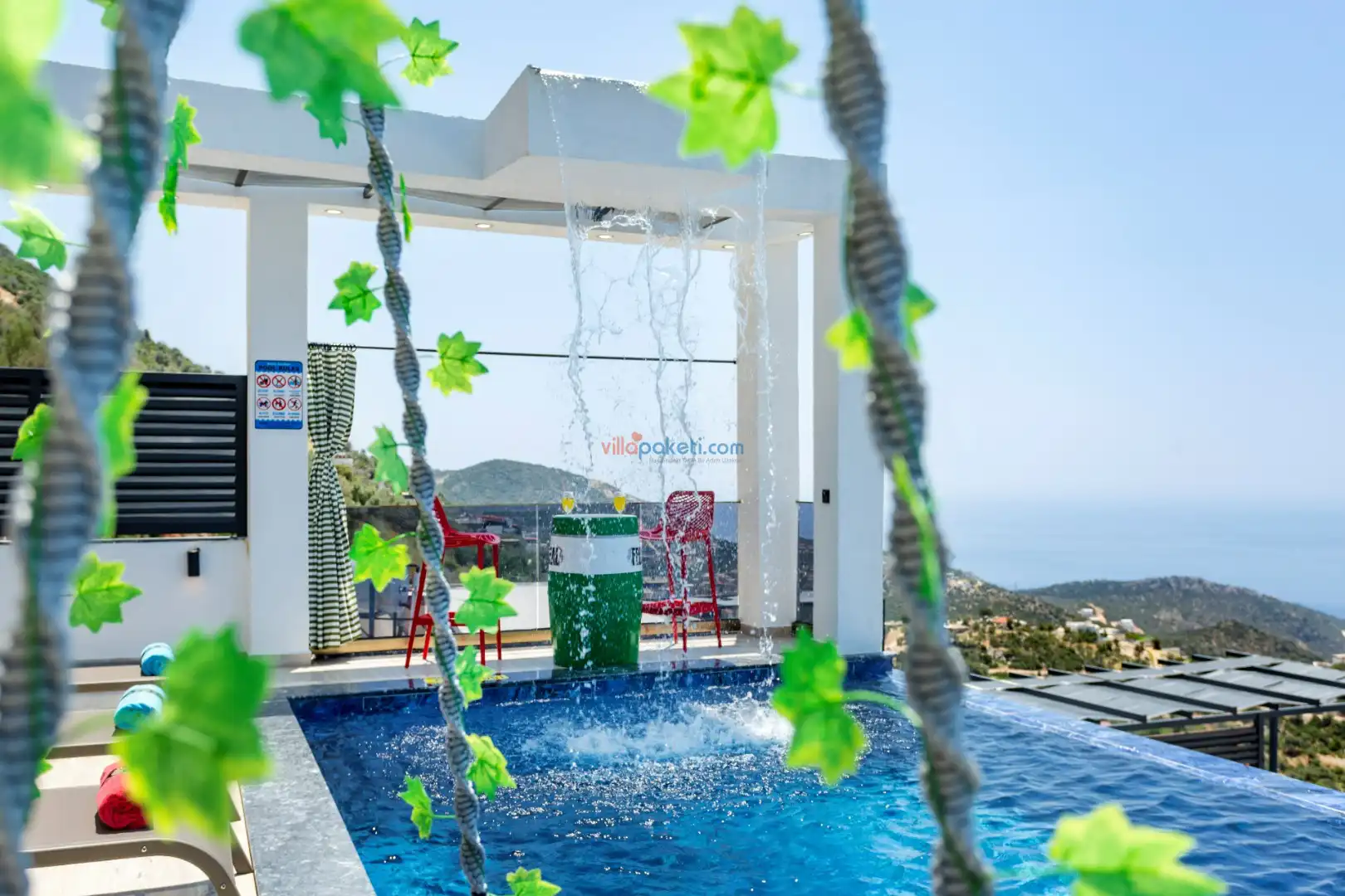 Villanın açık alanının arka tarafında çocuklar için kaydırak ve trambolin bulunur. Havuzun bulunduğu ön tarafta ise ferah bir oturma alanı, yemek masası, şelale gibi detaylar yer alır. Havuz terası gün boyunca güneş alır. Üstelik gün batımı için harika bir seyir terası olma özelliği taşır.