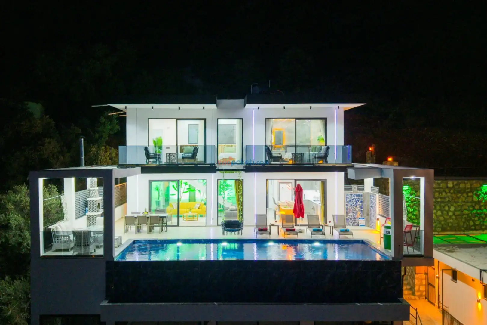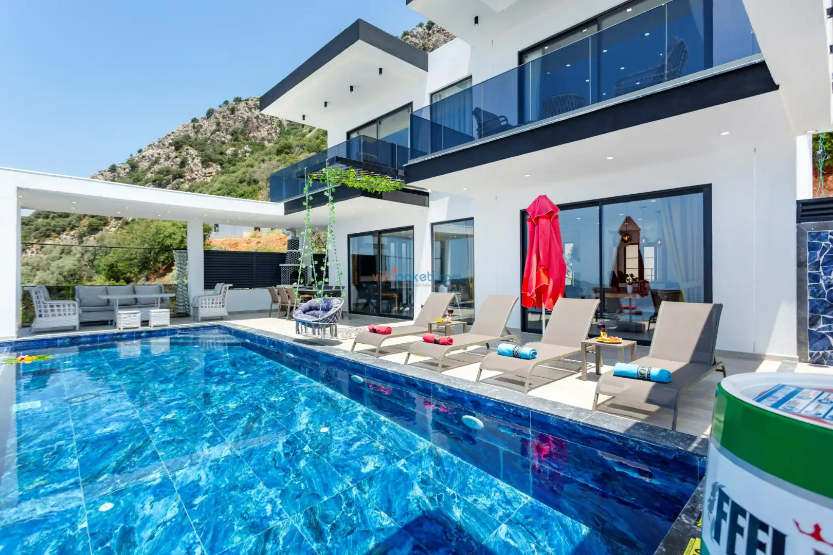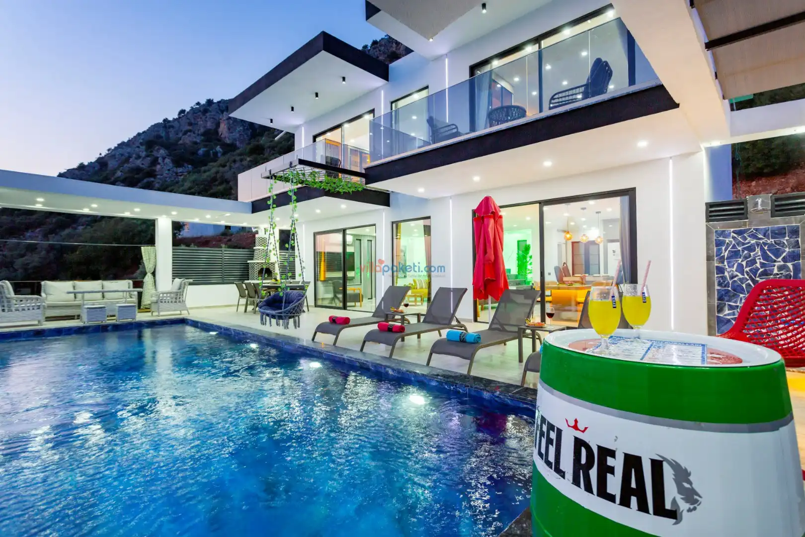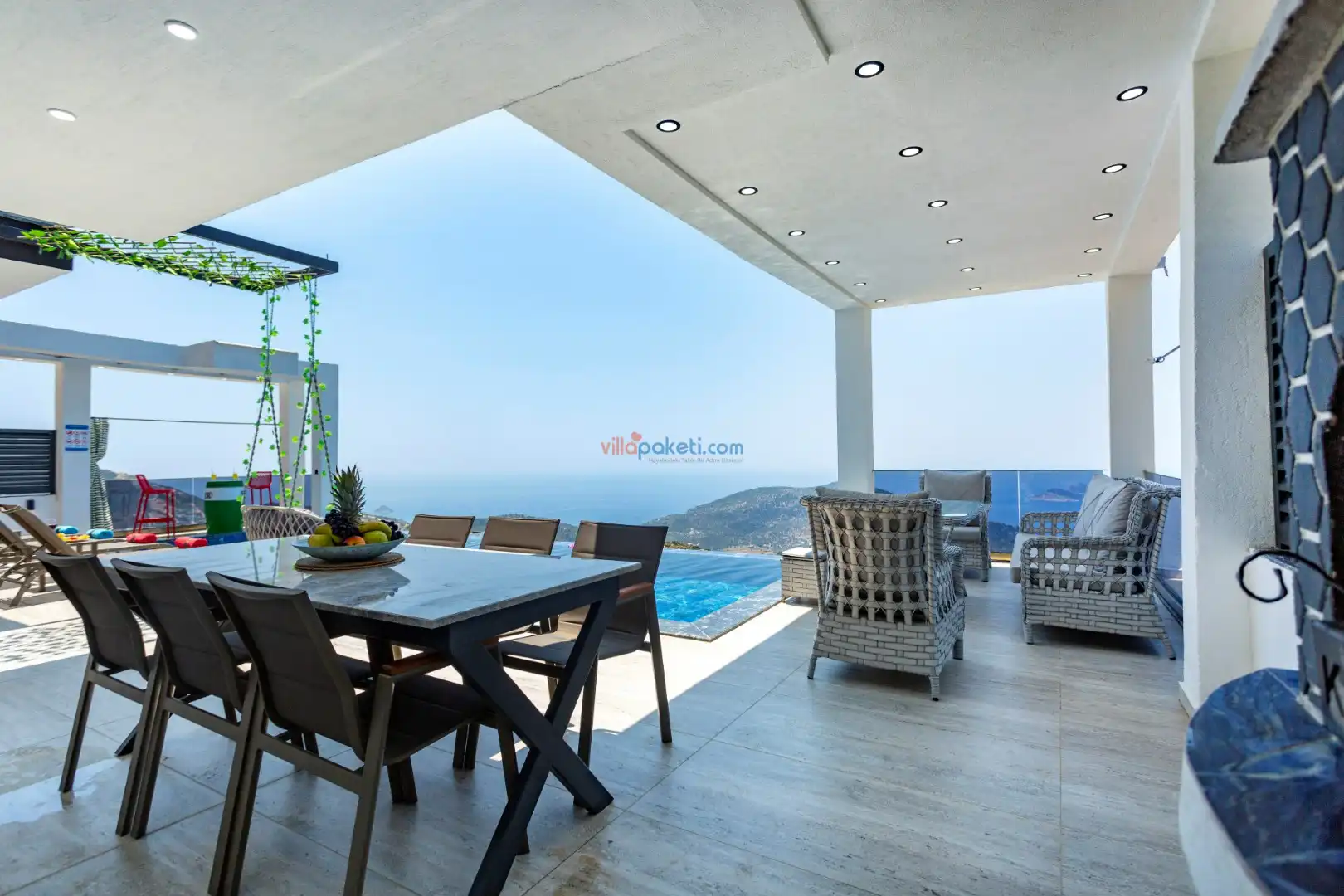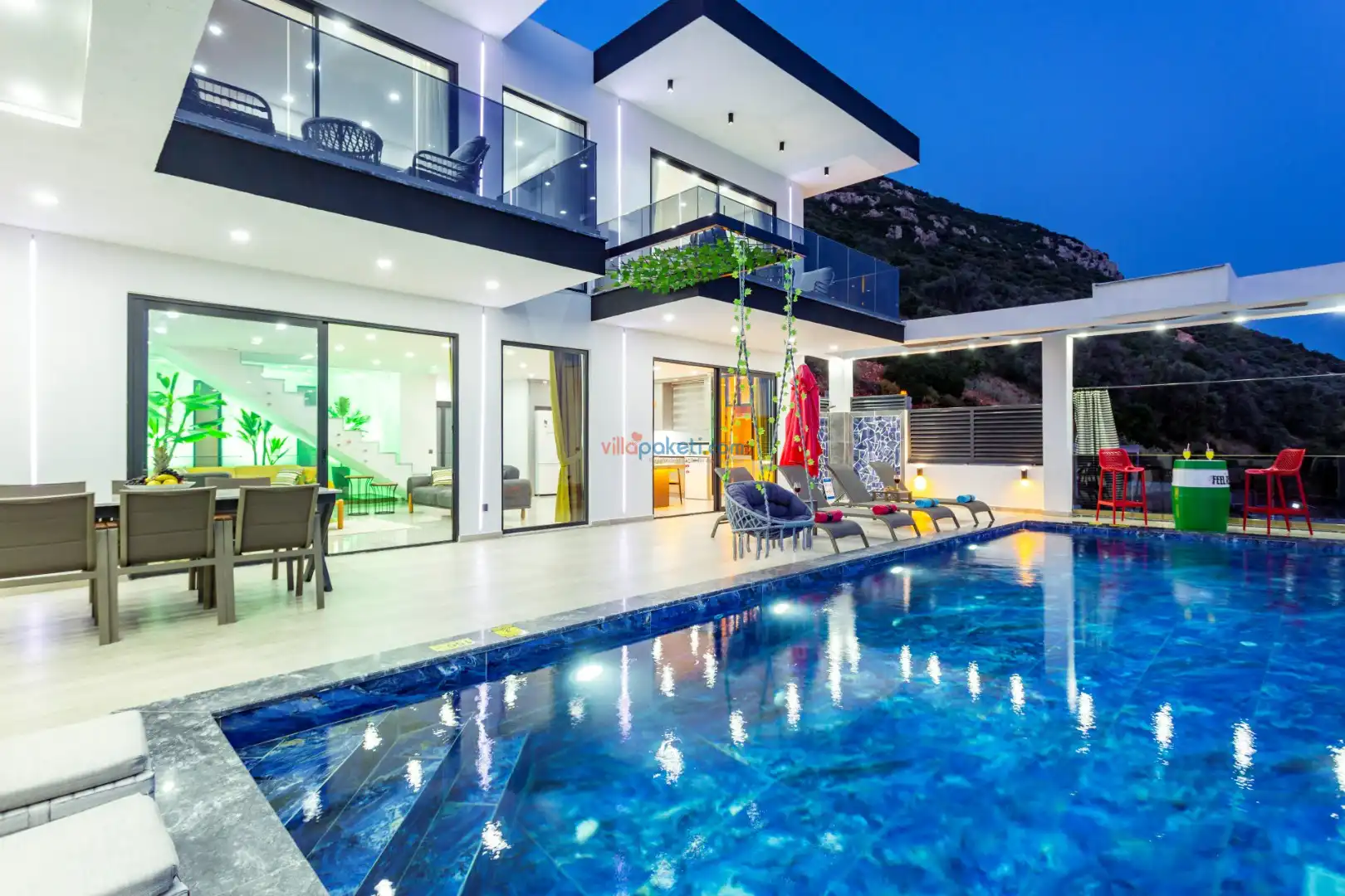 Villanın açık alanının arka tarafında çocuklar için kaydırak ve trambolin bulunur. Havuzun bulunduğu ön tarafta ise ferah bir oturma alanı, yemek masası, şelale gibi detaylar yer alır. Havuz terası gün boyunca güneş alır. Üstelik gün batımı için harika bir seyir terası olma özelliği taşır.
