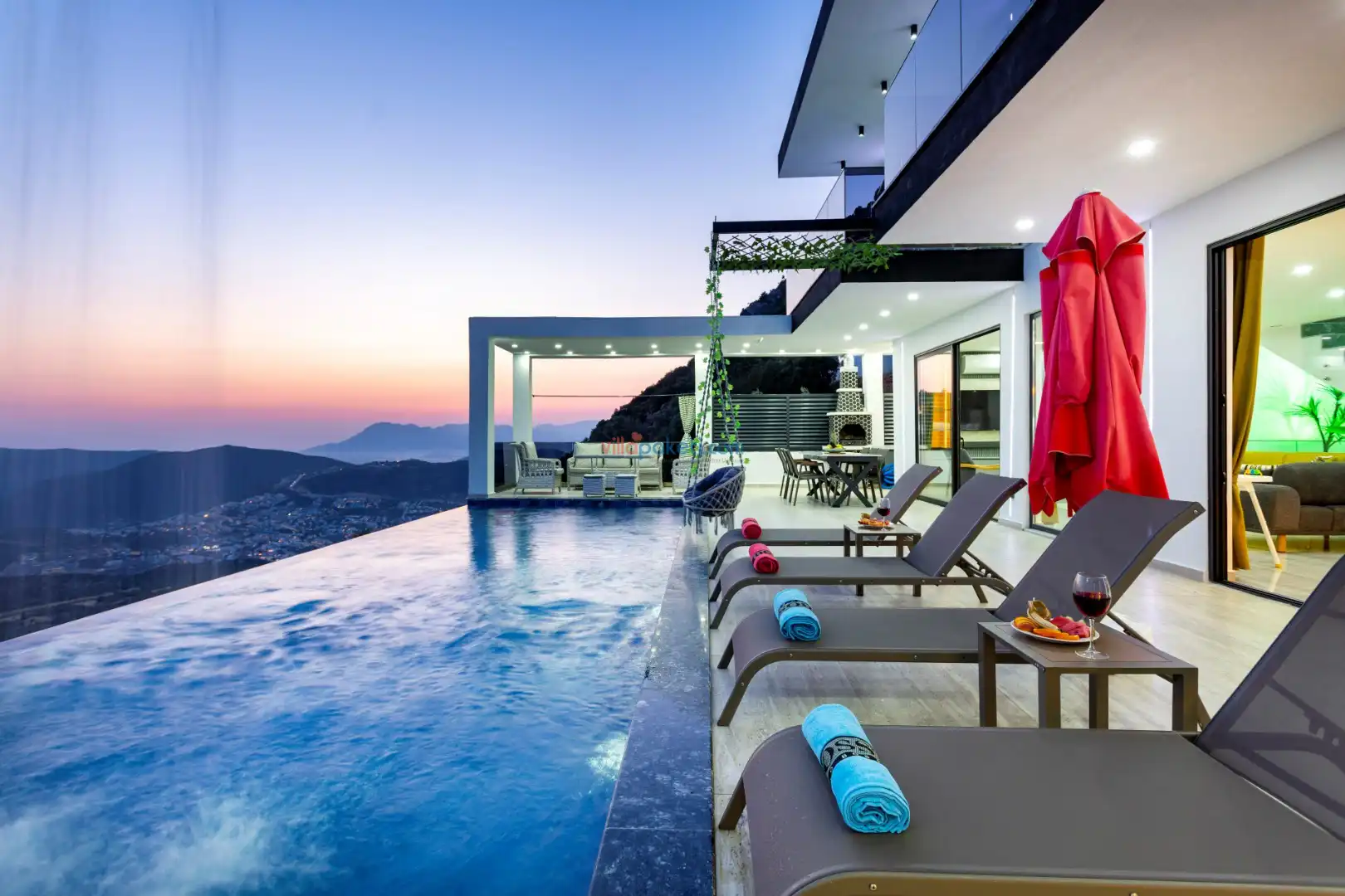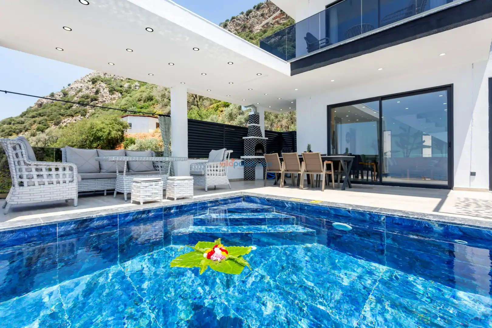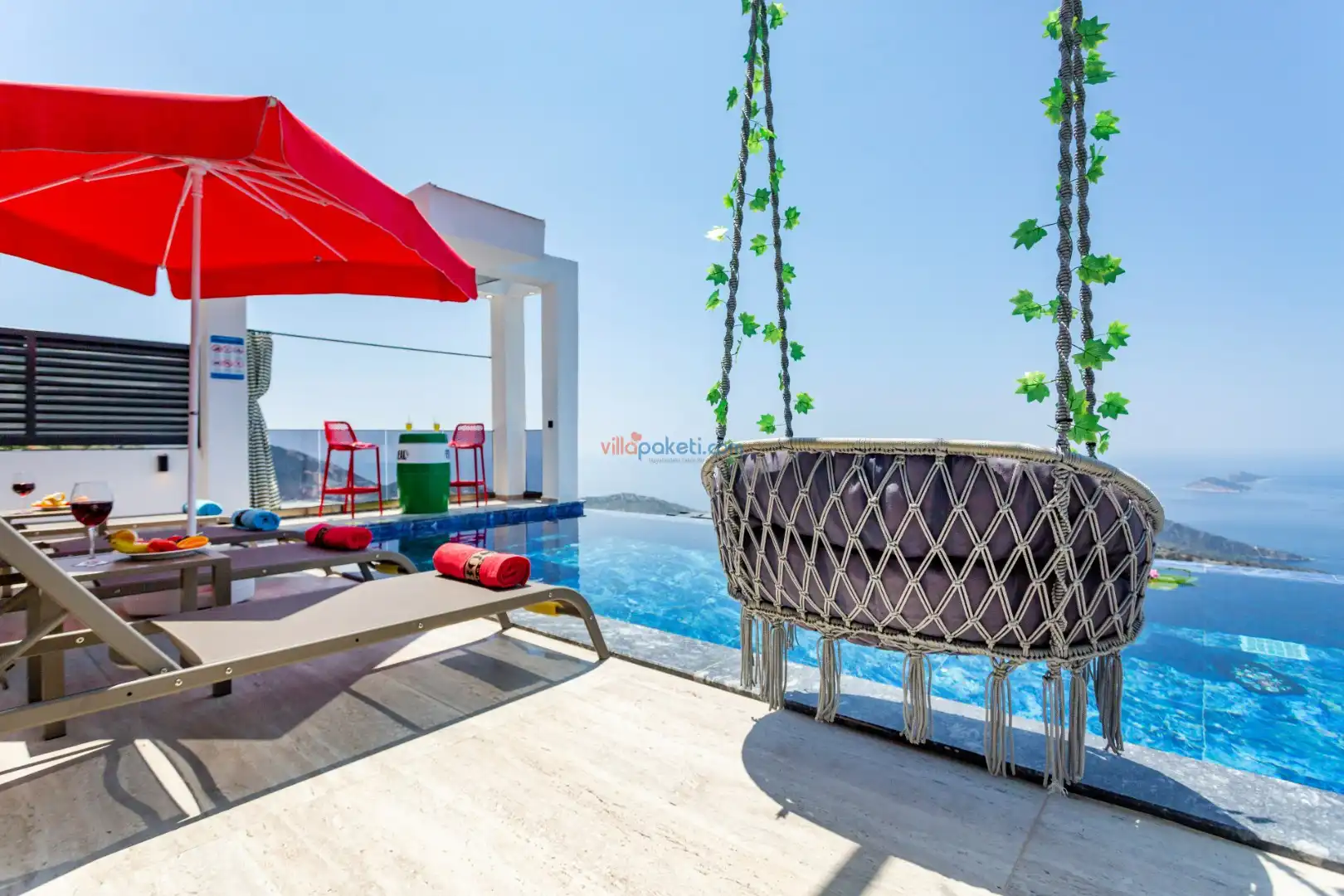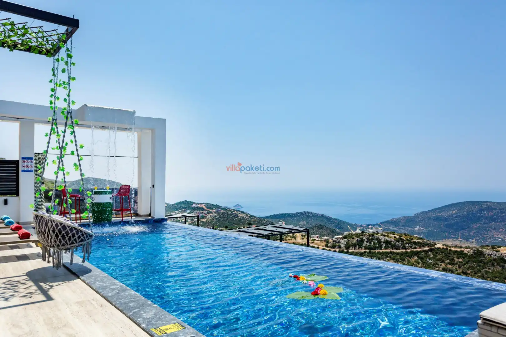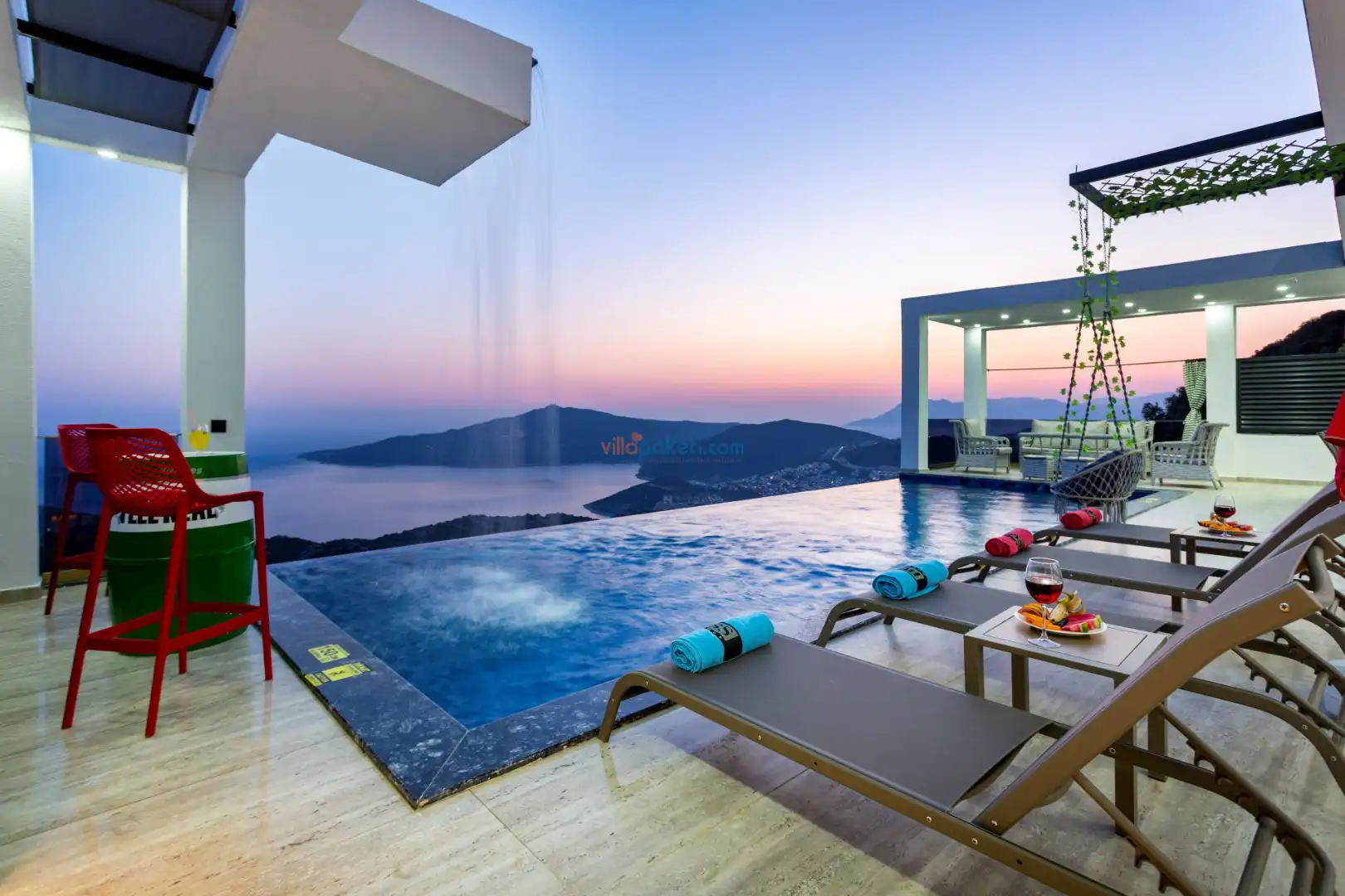 Villanın açık alanının arka tarafında çocuklar için kaydırak ve trambolin bulunur. Havuzun bulunduğu ön tarafta ise ferah bir oturma alanı, yemek masası, şelale gibi detaylar yer alır. Havuz terası gün boyunca güneş alır. Üstelik gün batımı için harika bir seyir terası olma özelliği taşır.
