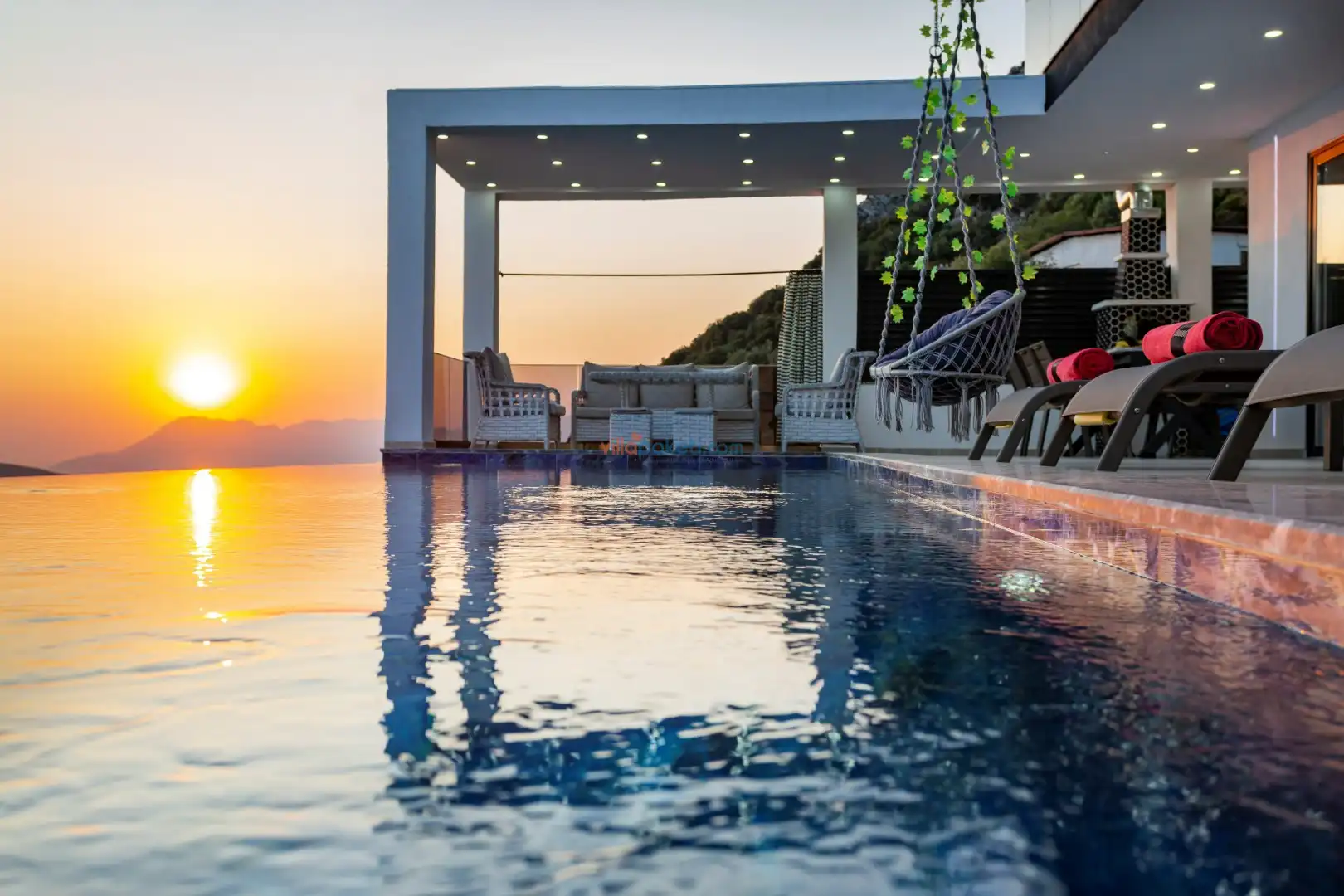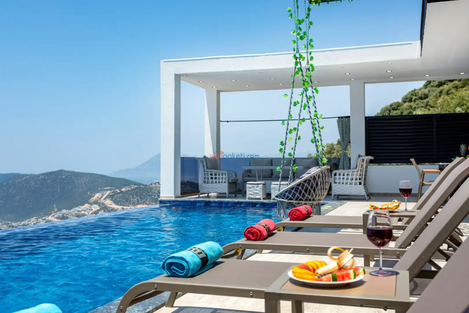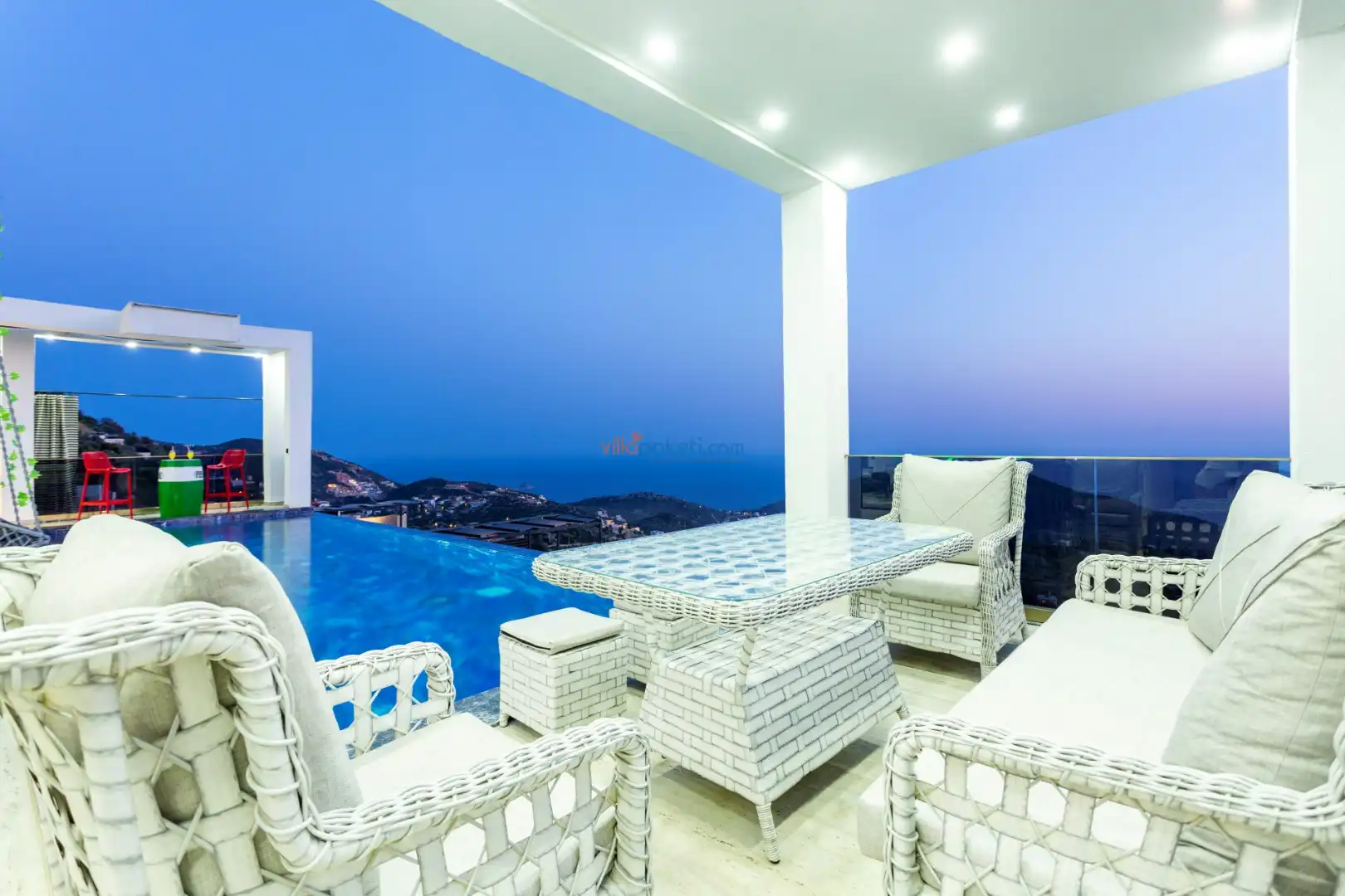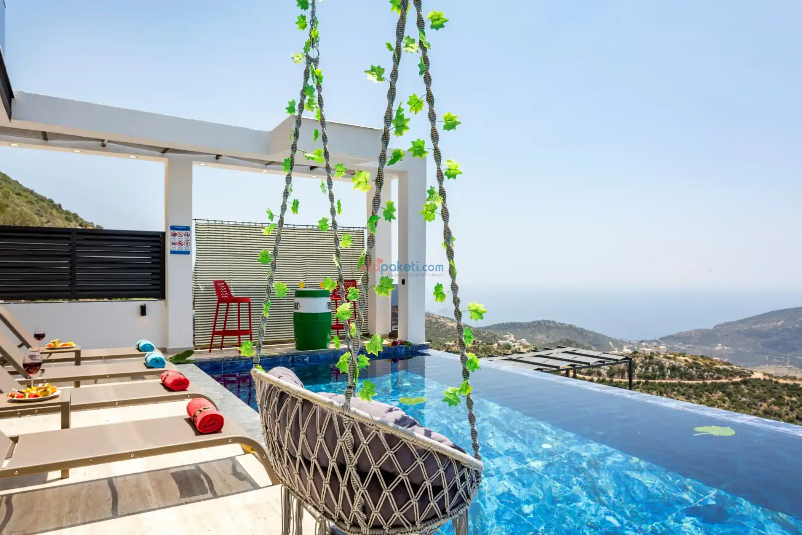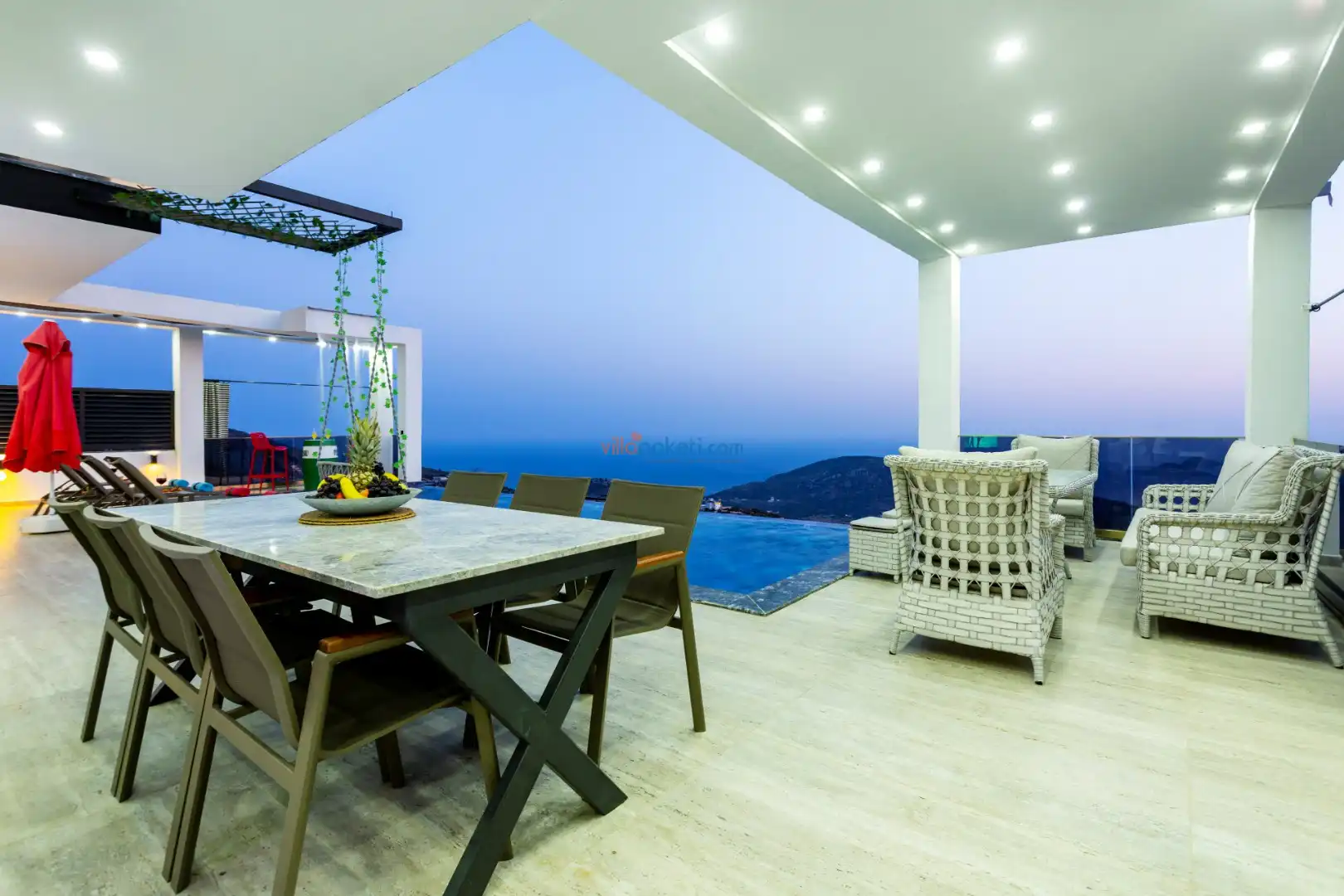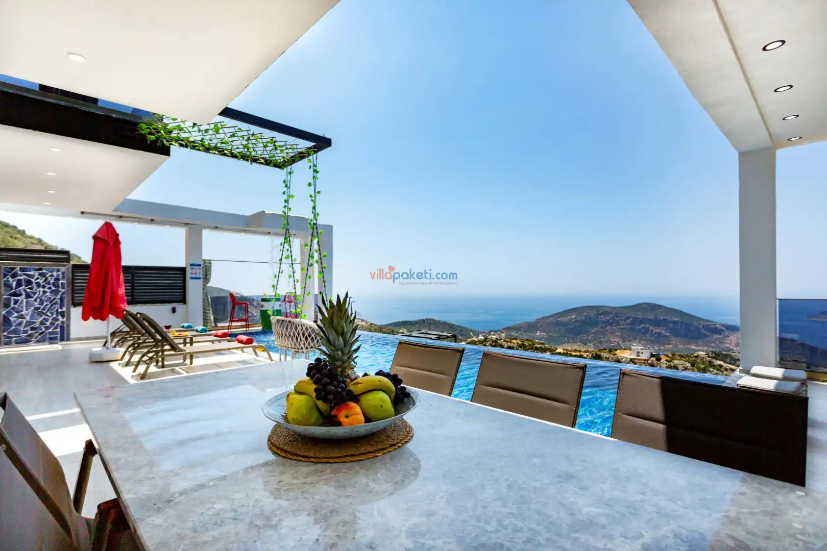 Villanın açık alanının arka tarafında çocuklar için kaydırak ve trambolin bulunur. Havuzun bulunduğu ön tarafta ise ferah bir oturma alanı, yemek masası, şelale gibi detaylar yer alır. Havuz terası gün boyunca güneş alır. Üstelik gün batımı için harika bir seyir terası olma özelliği taşır.