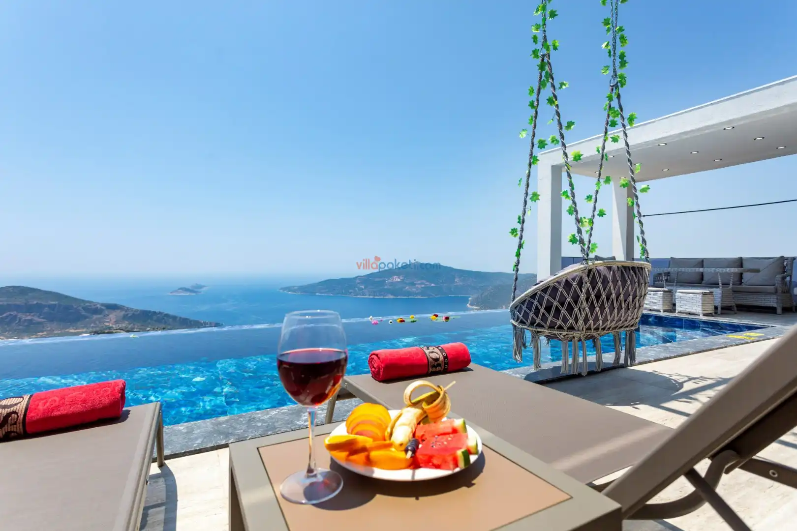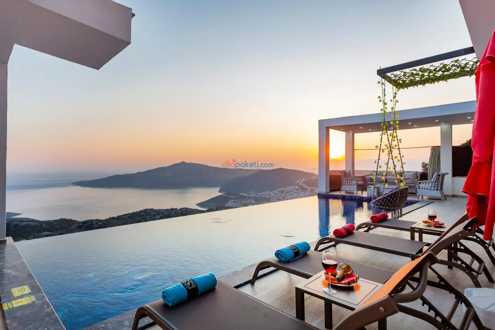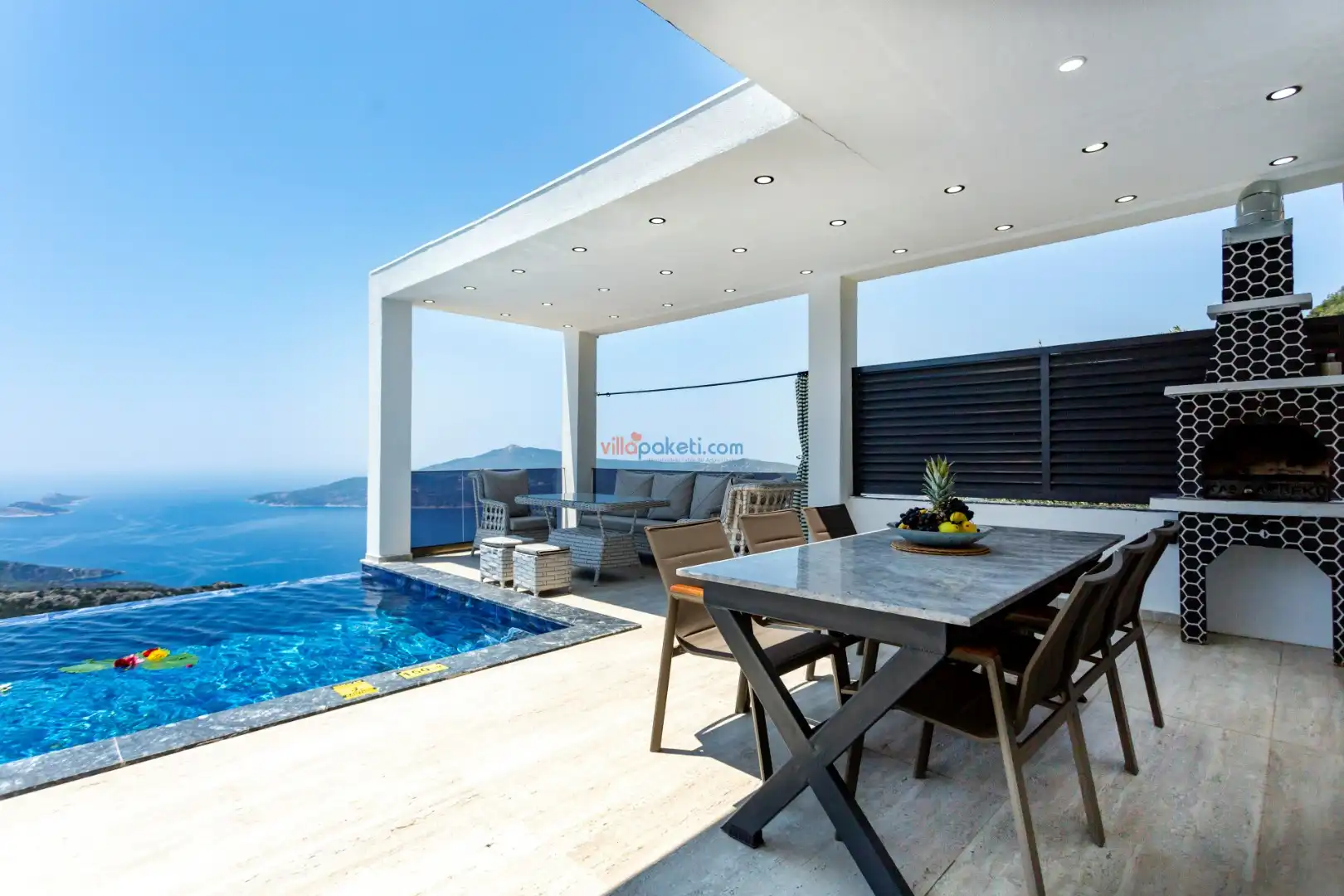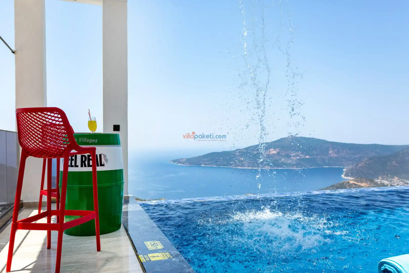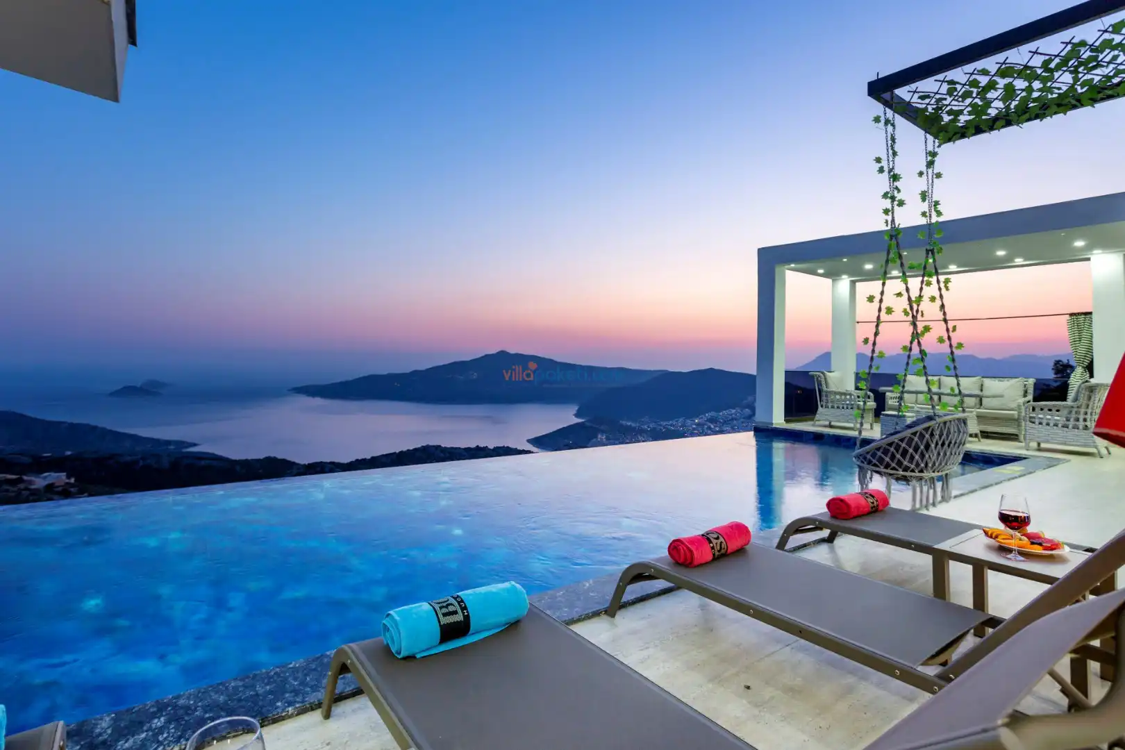 Villanın açık alanının arka tarafında çocuklar için kaydırak ve trambolin bulunur. Havuzun bulunduğu ön tarafta ise ferah bir oturma alanı, yemek masası, şelale gibi detaylar yer alır. Havuz terası gün boyunca güneş alır. Üstelik gün batımı için harika bir seyir terası olma özelliği taşır.