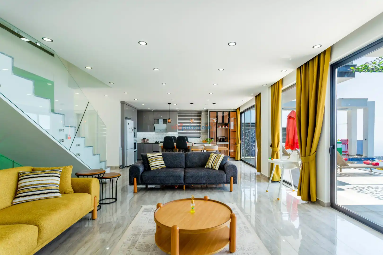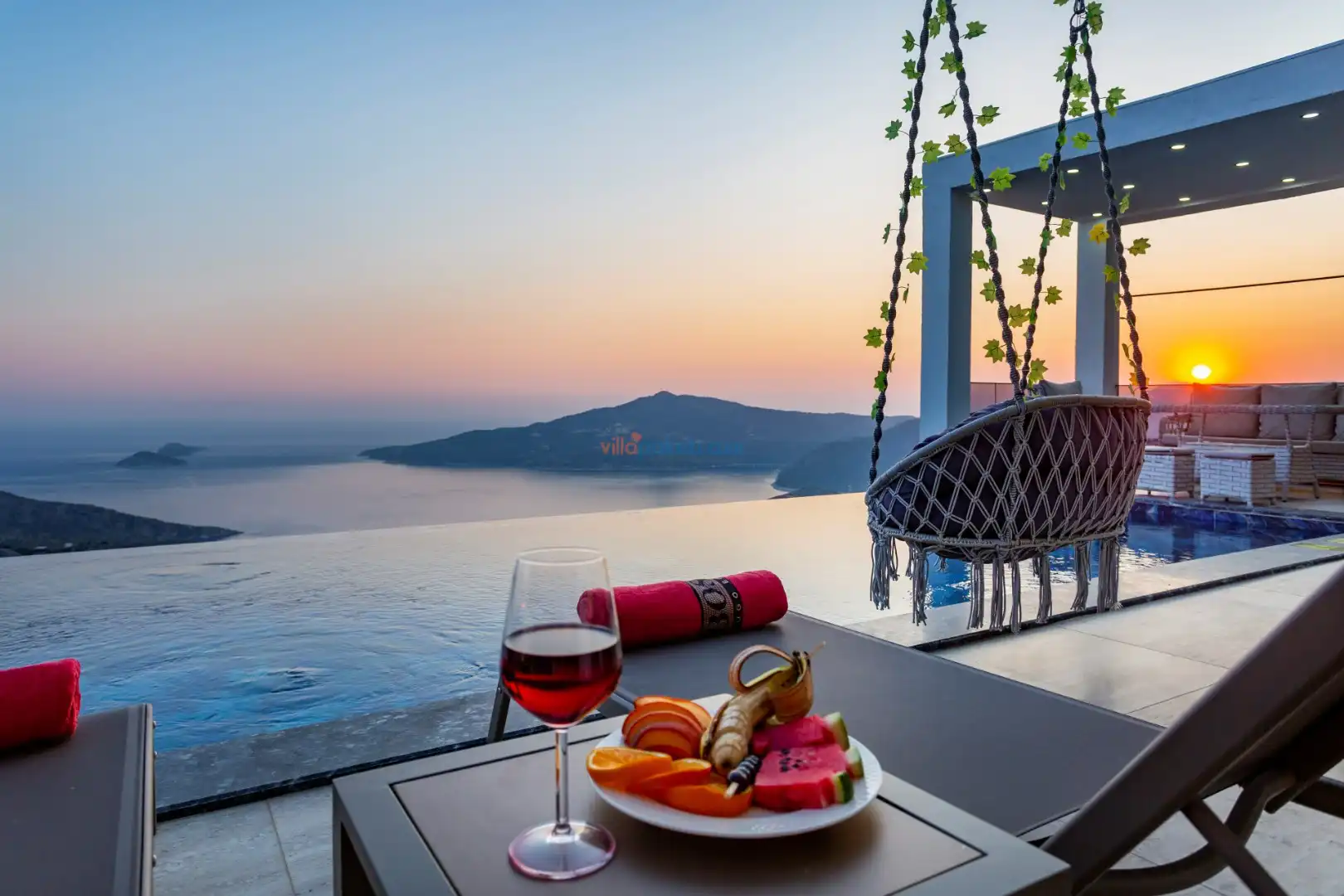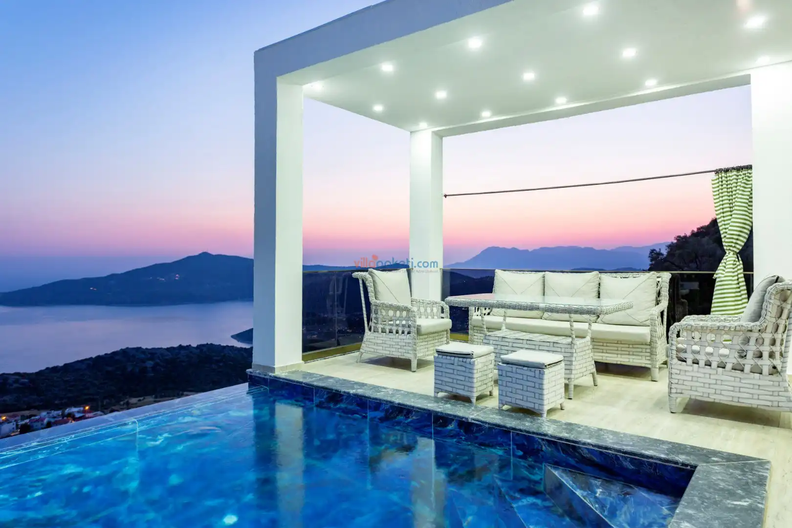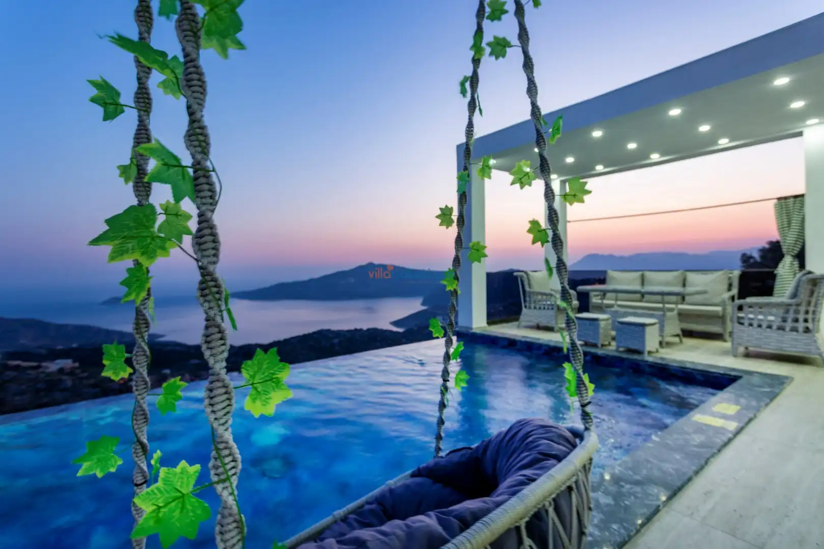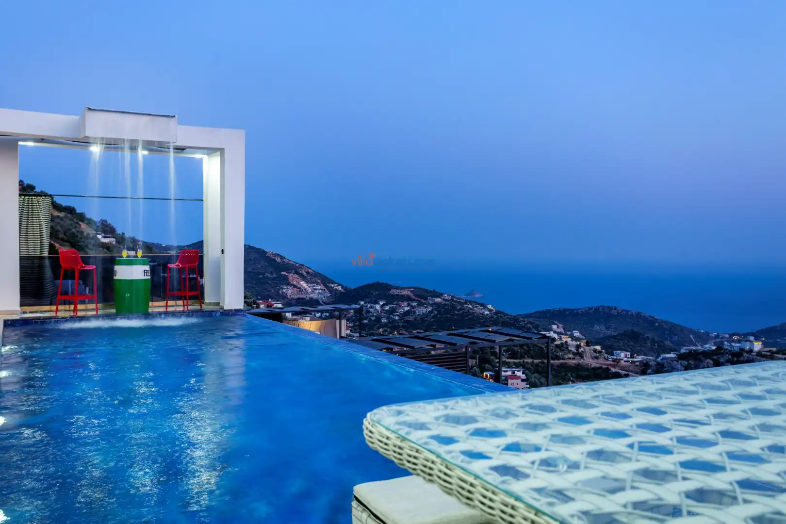 Villanın açık alanının arka tarafında çocuklar için kaydırak ve trambolin bulunur. Havuzun bulunduğu ön tarafta ise ferah bir oturma alanı, yemek masası, şelale gibi detaylar yer alır. Havuz terası gün boyunca güneş alır. Üstelik gün batımı için harika bir seyir terası olma özelliği taşır.