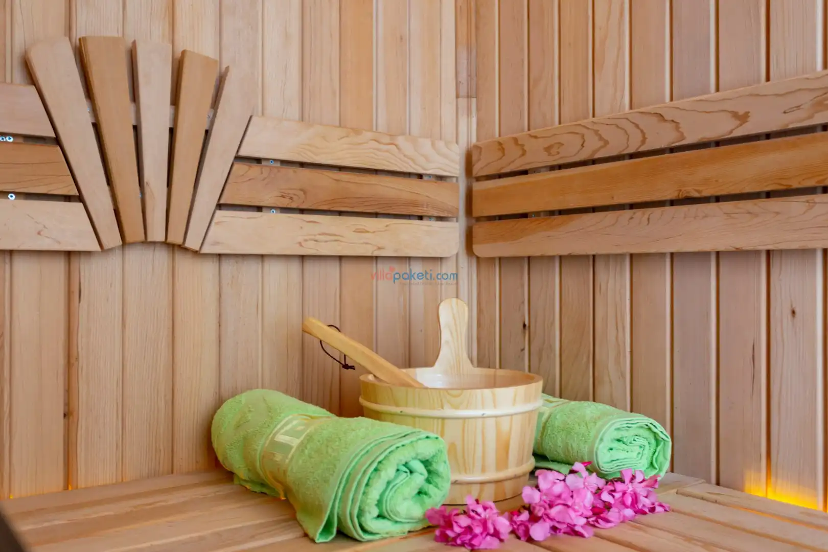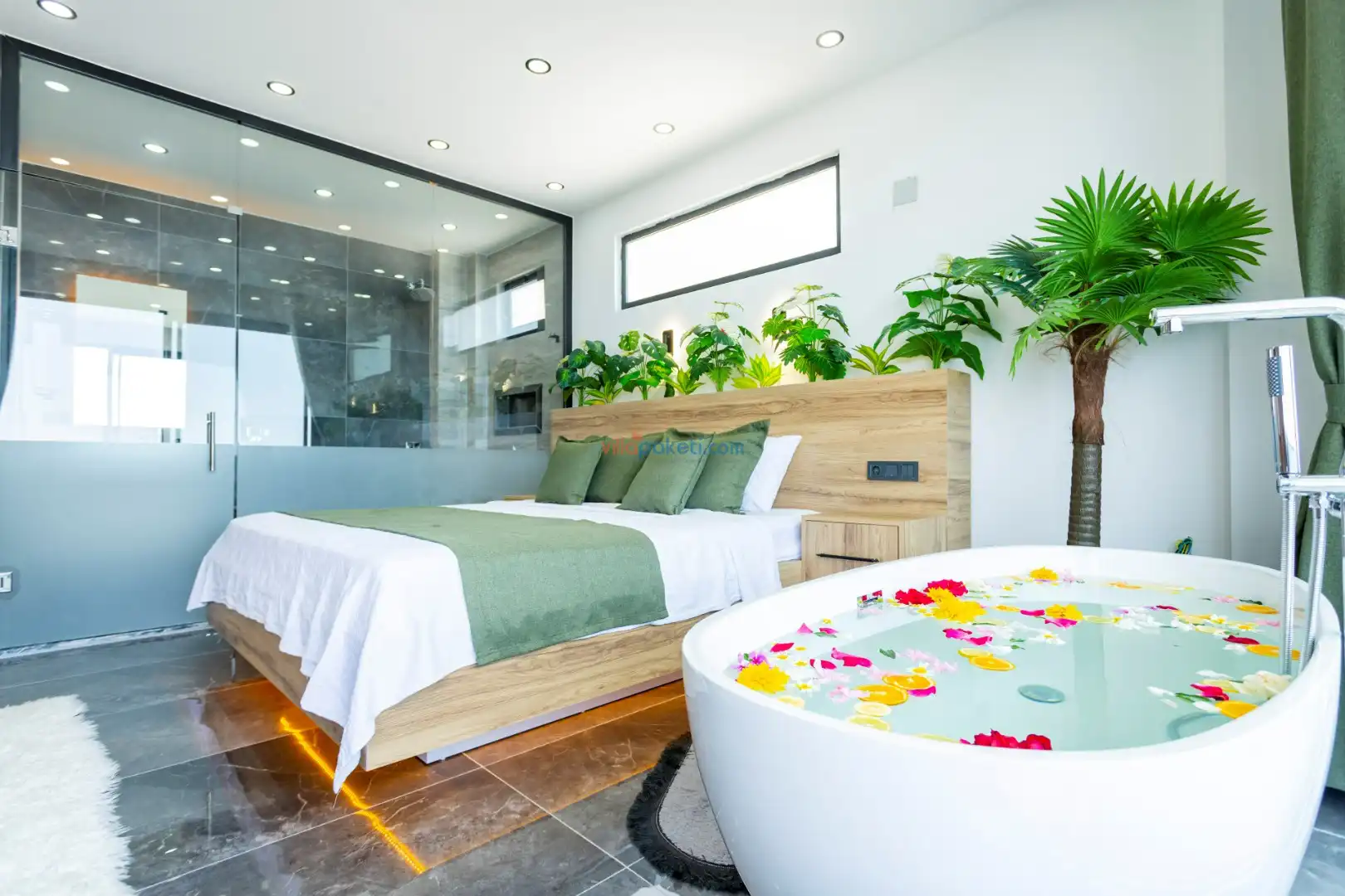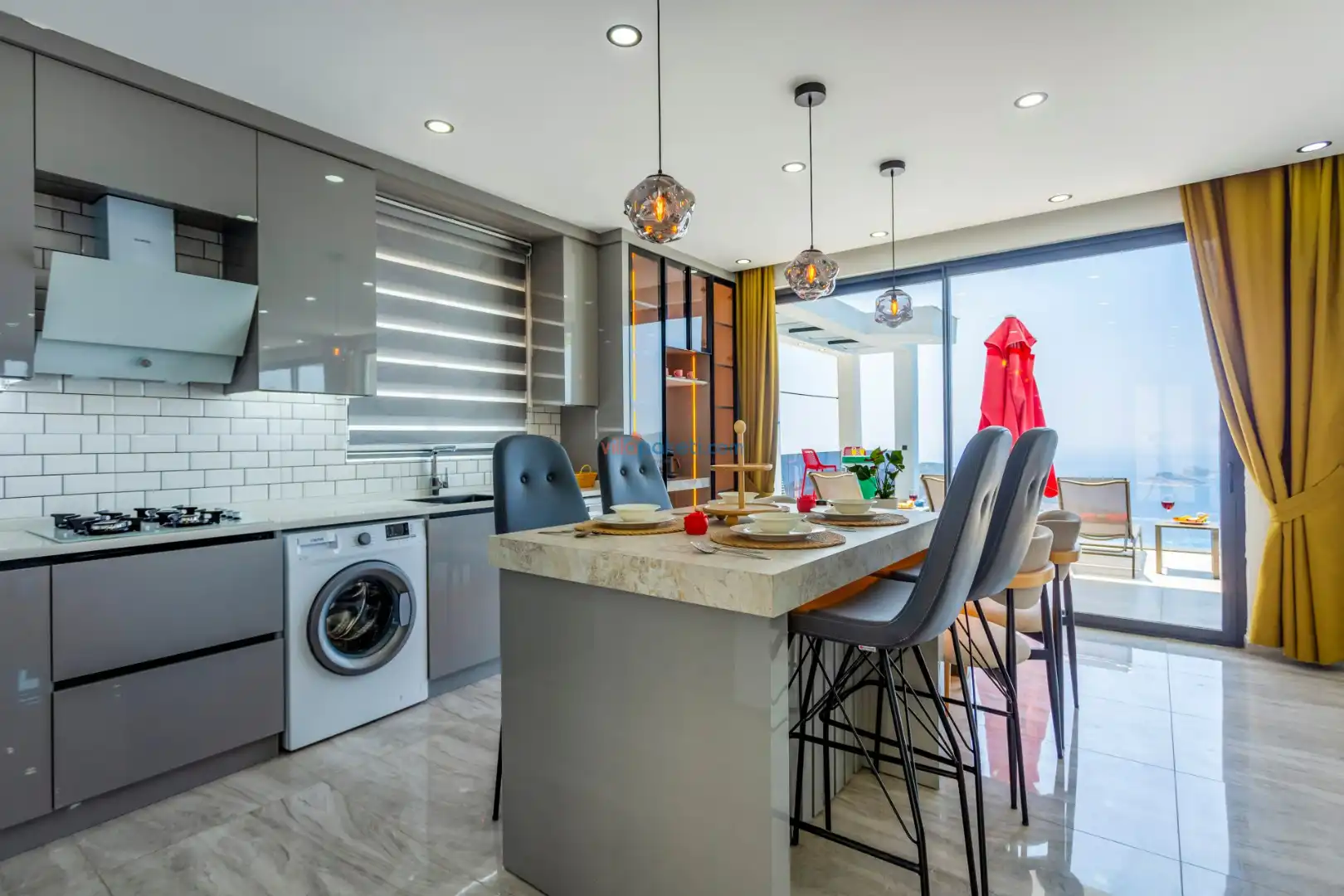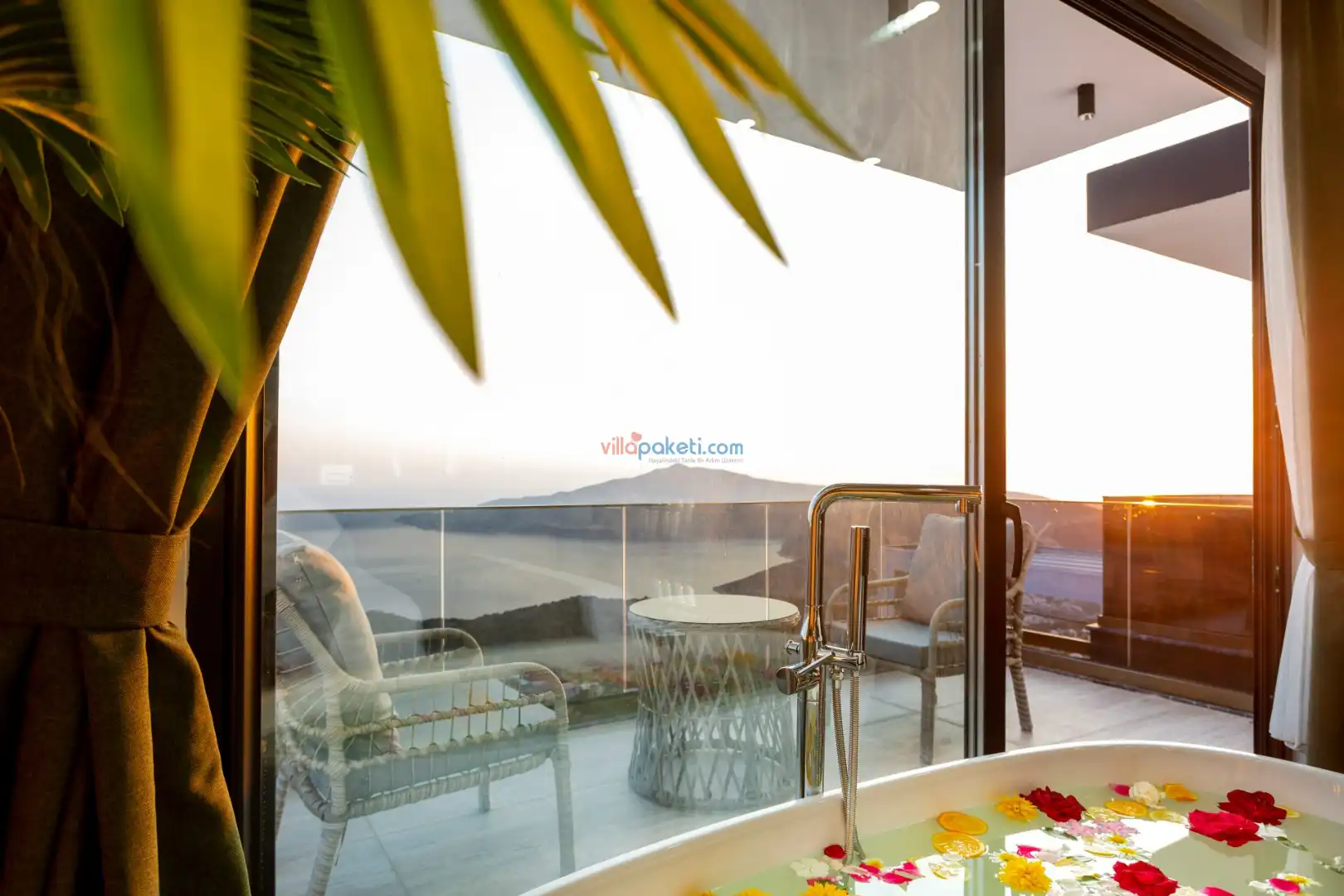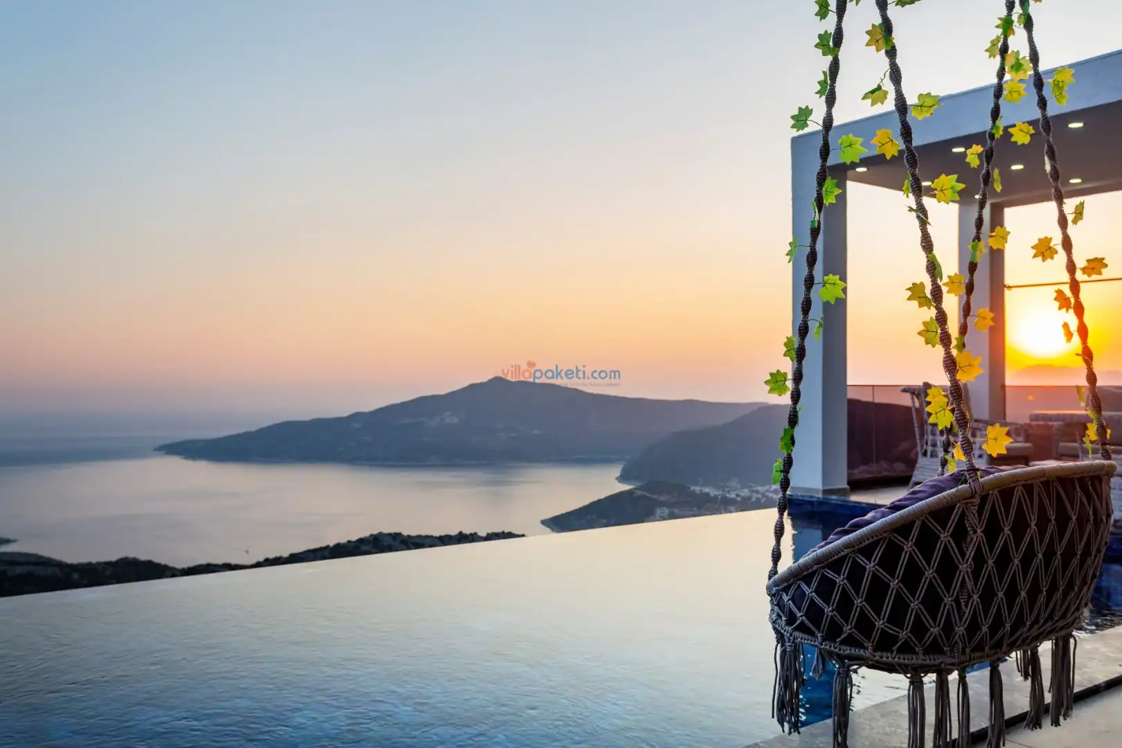Villanın açık alanının arka tarafında çocuklar için kaydırak ve trambolin bulunur. Havuzun bulunduğu ön tarafta ise ferah bir oturma alanı, yemek masası, şelale gibi detaylar yer alır. Havuz terası gün boyunca güneş alır. Üstelik gün batımı için harika bir seyir terası olma özelliği taşır.