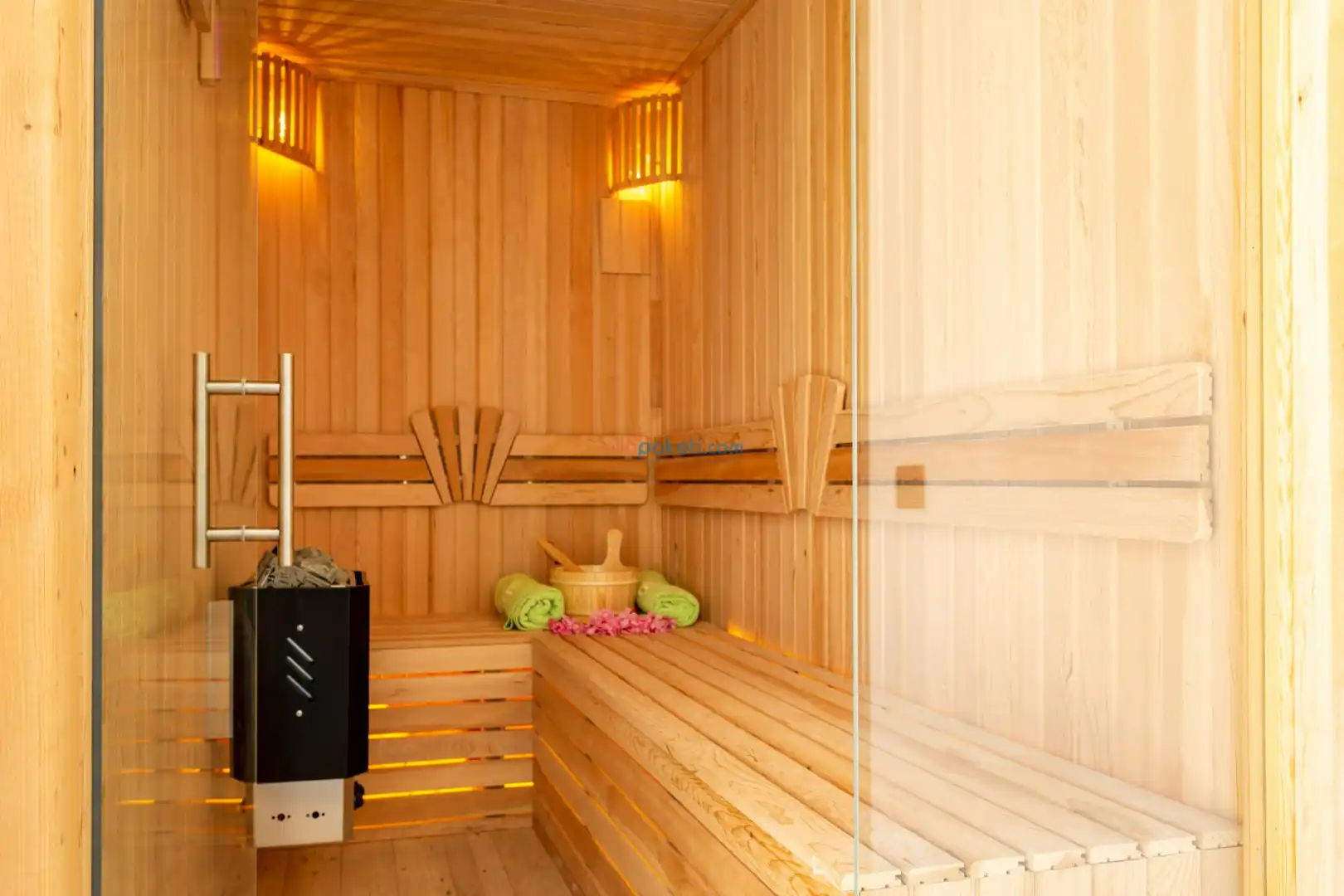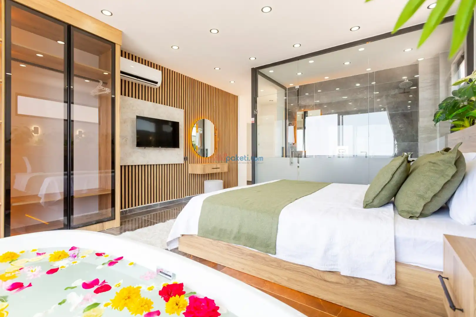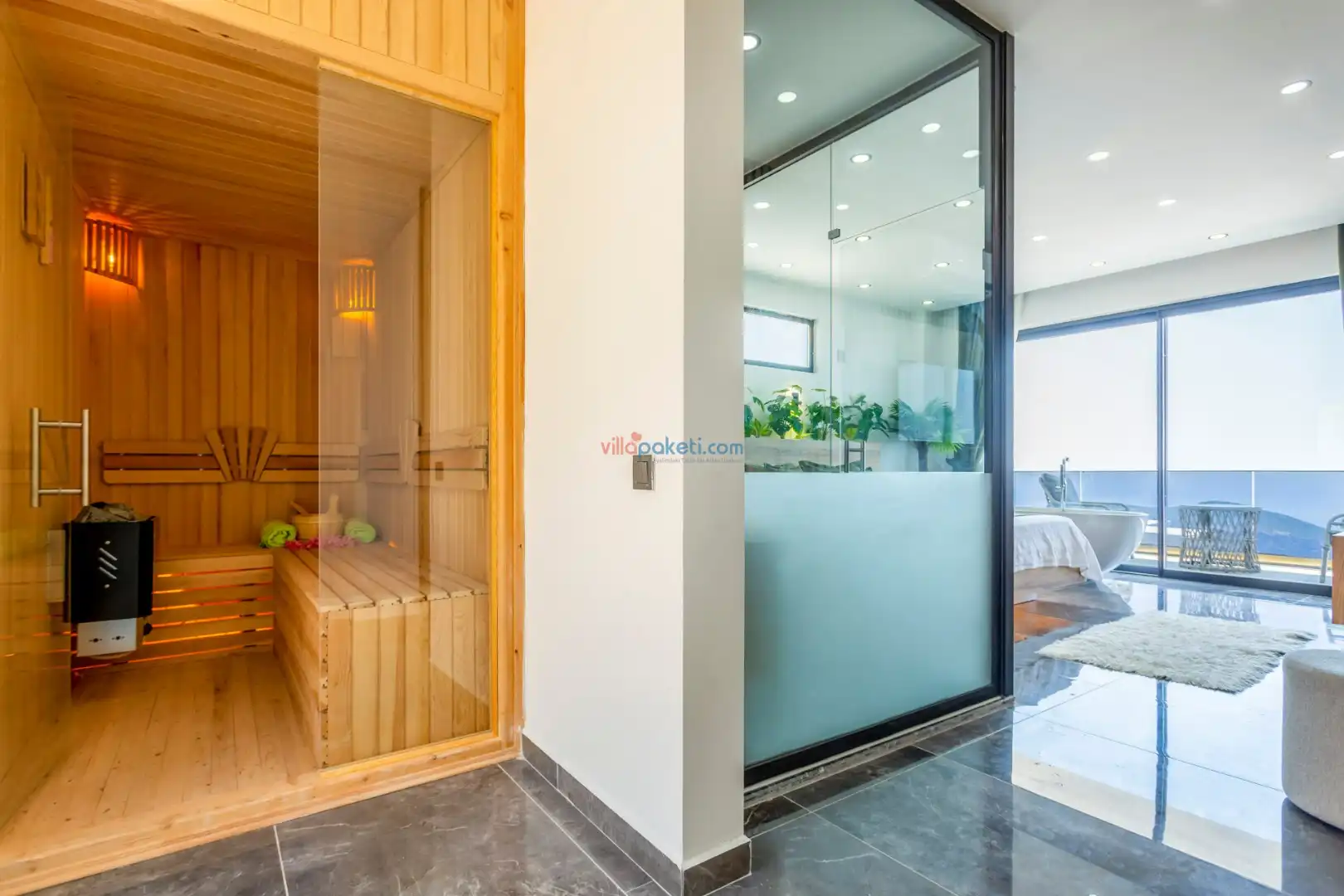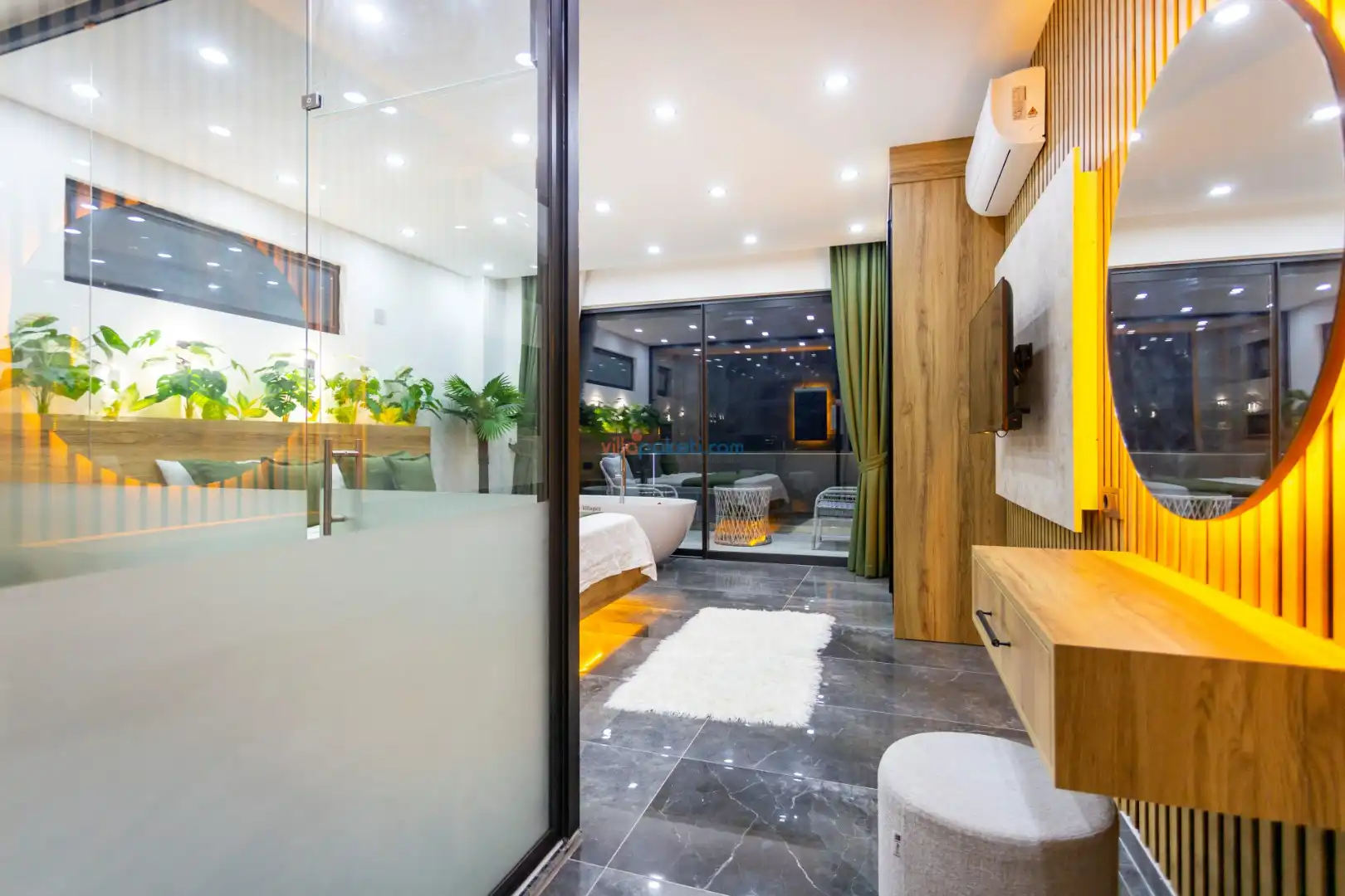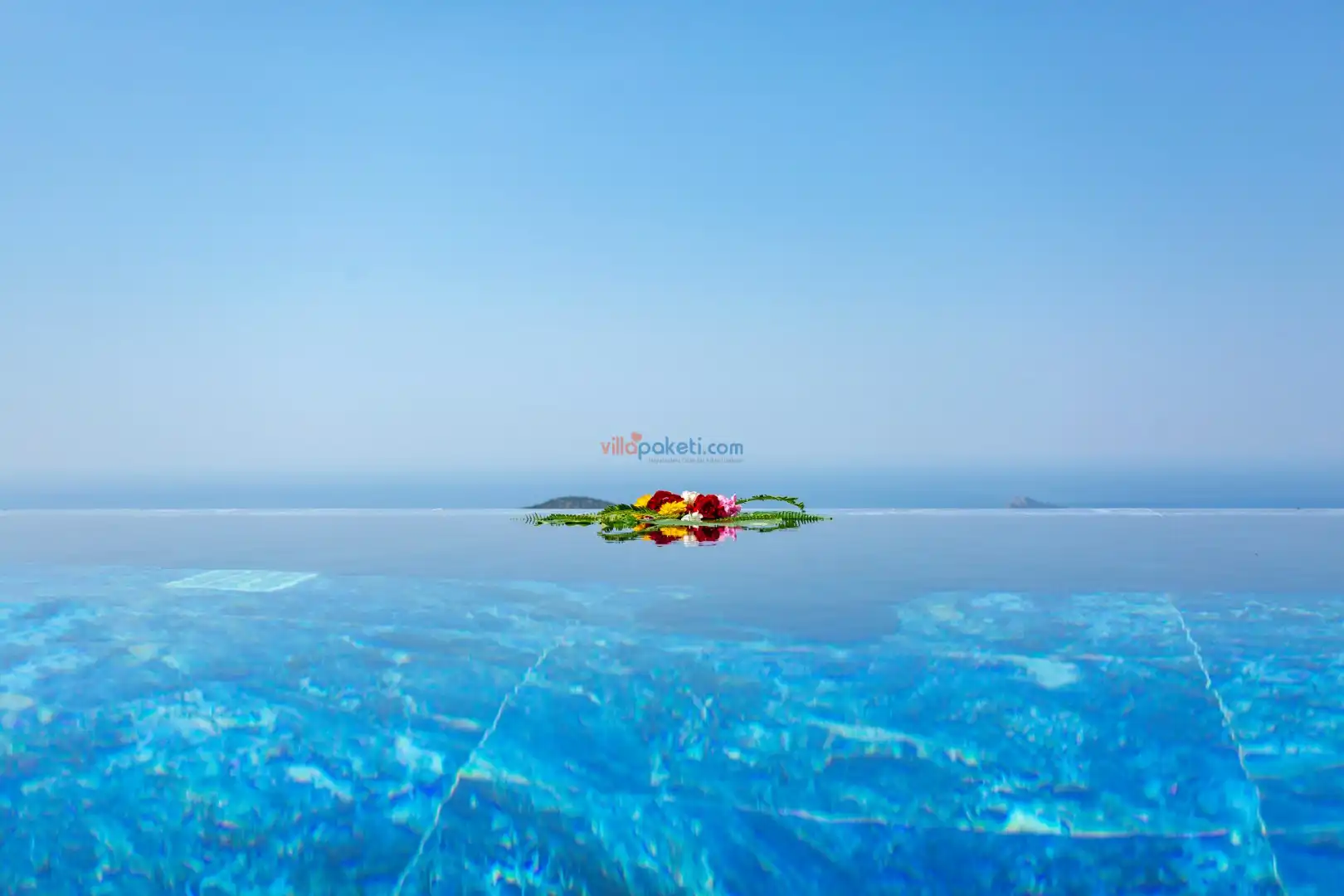 Villanın açık alanının arka tarafında çocuklar için kaydırak ve trambolin bulunur. Havuzun bulunduğu ön tarafta ise ferah bir oturma alanı, yemek masası, şelale gibi detaylar yer alır. Havuz terası gün boyunca güneş alır. Üstelik gün batımı için harika bir seyir terası olma özelliği taşır.