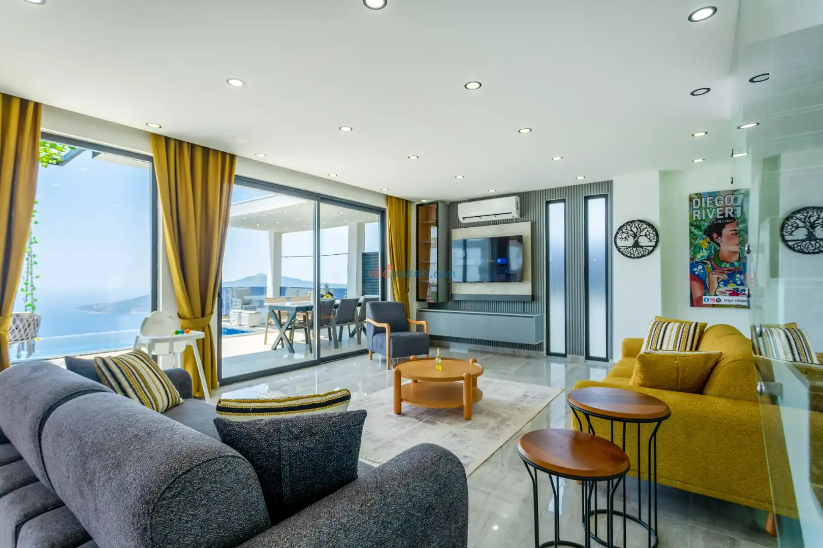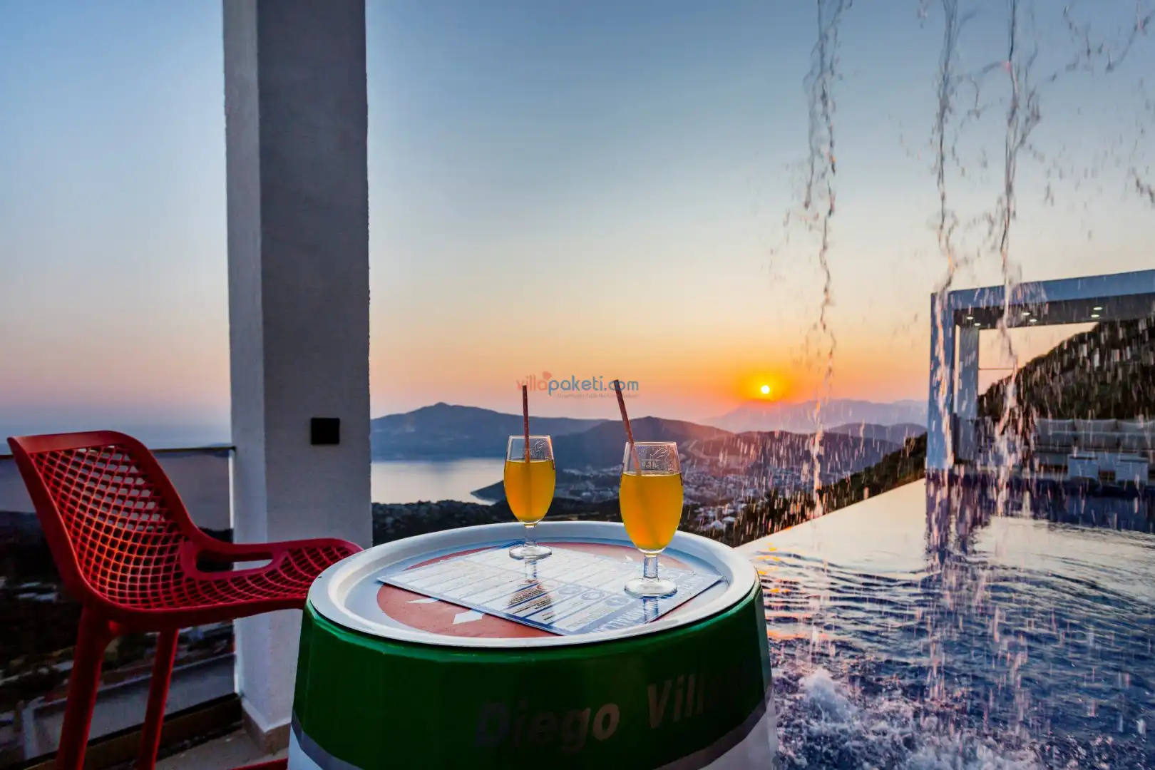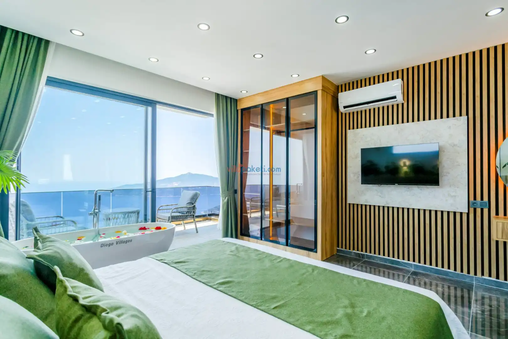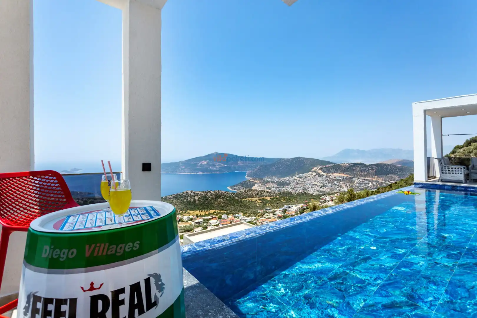 Villa Diego Kalkan merkeze yaklaşık 5 kilometrelik bir mesafede yer alan tatil villası seçeneğidir. Havuz alanı yabancı gözlerden izole ve nefes kesen bir deniz manzarasına sahiptir. Aynı şekilde üst katta bulunan 2 yatak odası deniz ve şehir manzarasına hakimdir. Yatak odalarından biri içinde, şık bir küvet de yer alan ana yatak odasıdır. Diğer yatak odasında ise bir adet çift kişilik yatak, bir adet tek kişilik yatak yer alır. 5 kişilik kapasite bu şekilde sağlanmış olur.