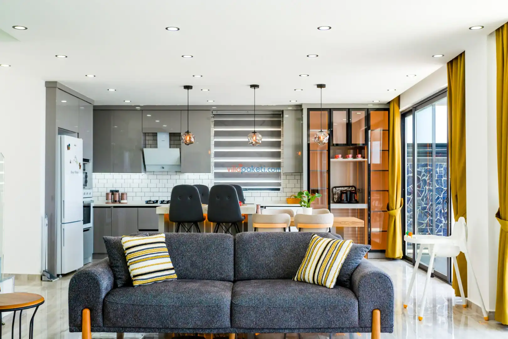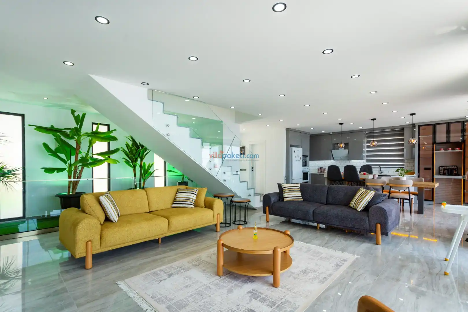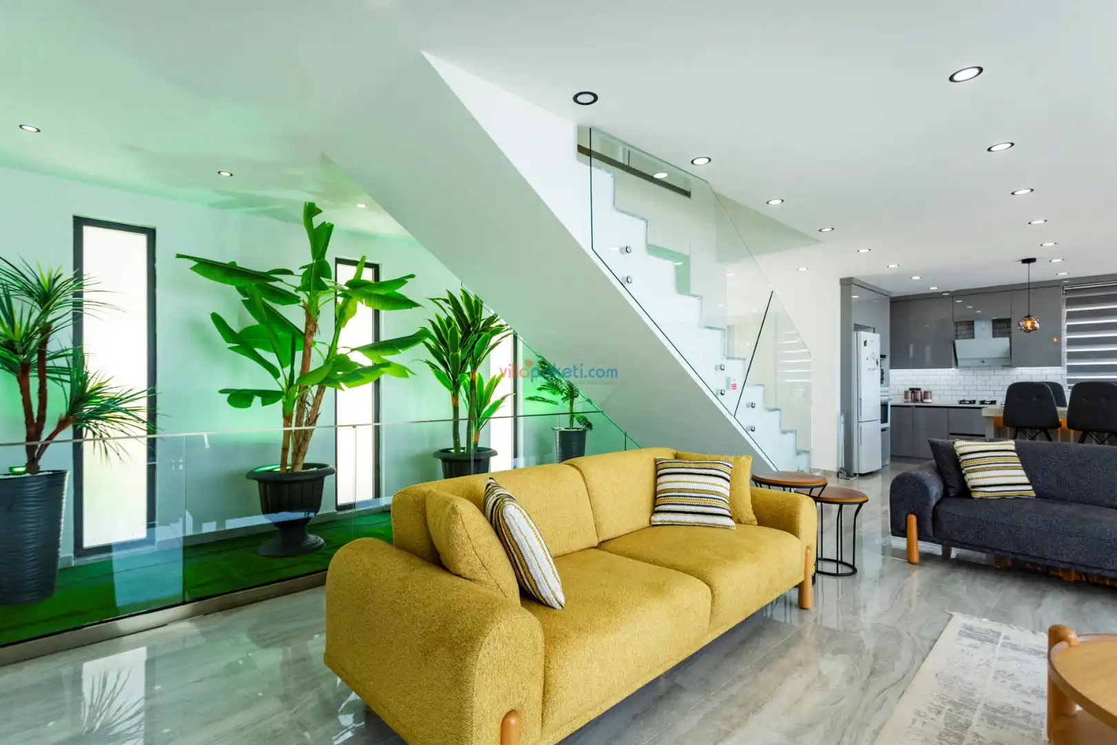 Modern mobilyalarla döşenmiş zemin kat; amerikan mutfak, kat bahçesi salondan oluşur.