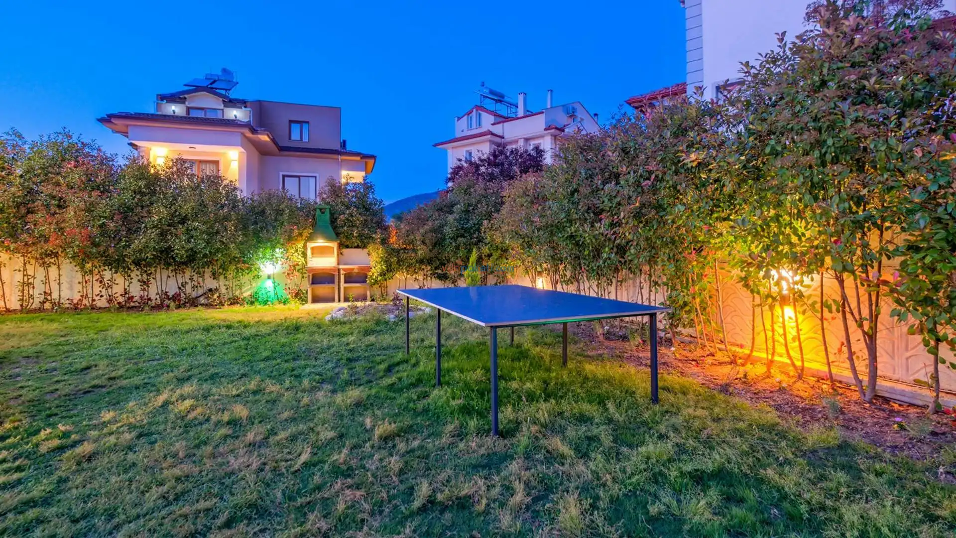 Geniş, çim kaplı bahçe alanı