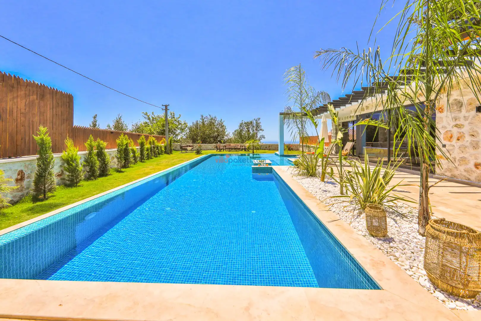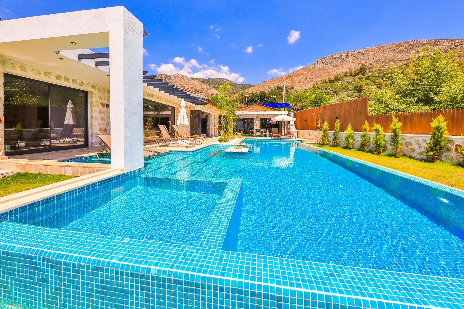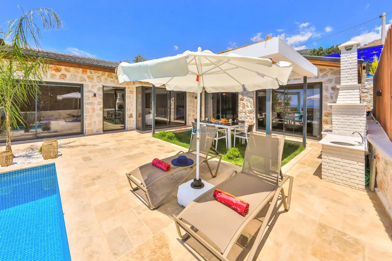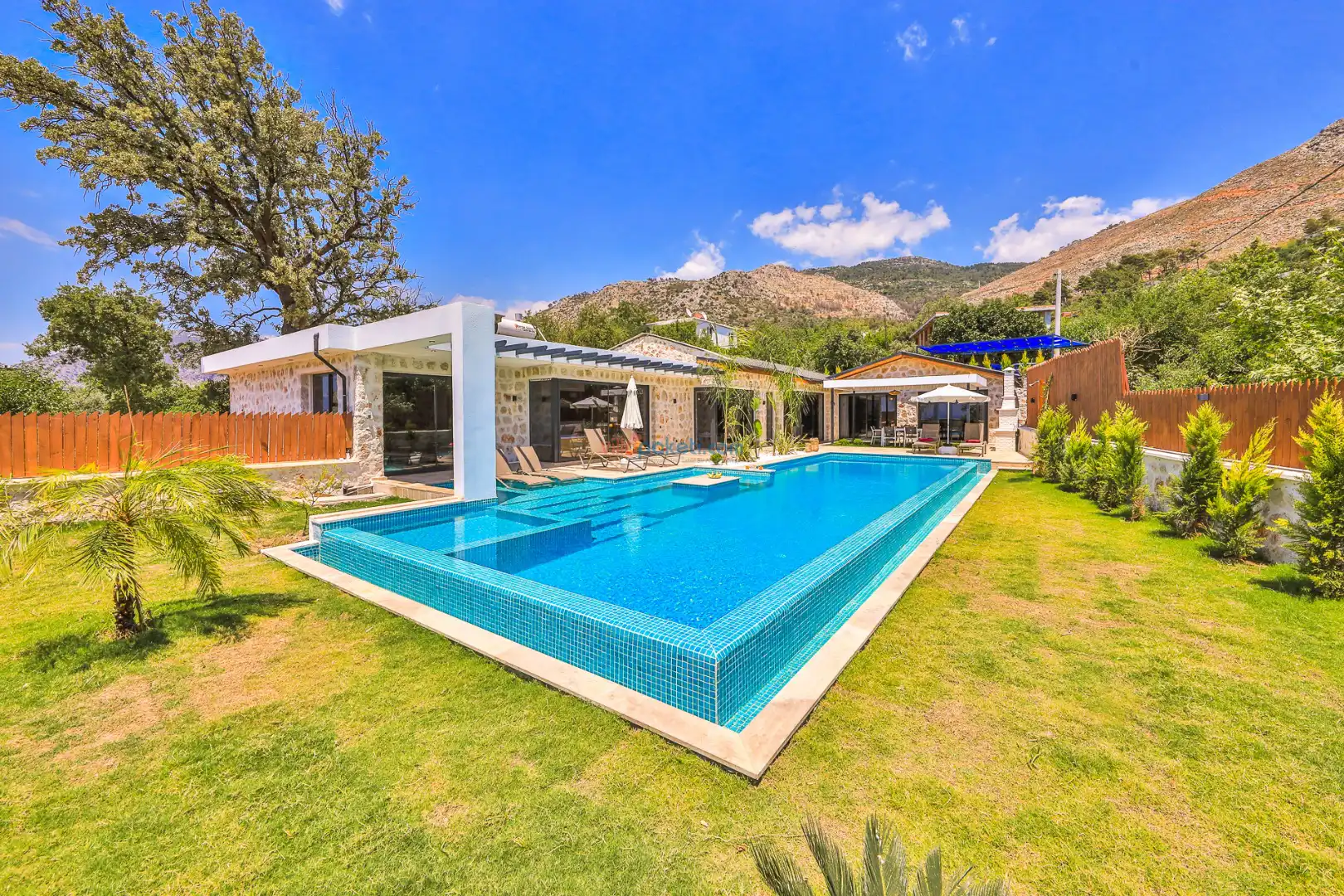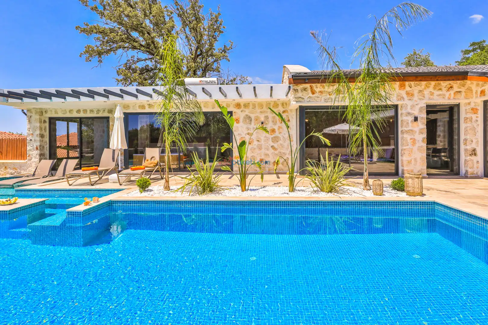 Villa Tan Üzümlü-Kalkan bölgesinde konumlanmış 3 yatak odalı ve 6 kişilik kapasitesiyle aileniz ve arkadaş grubunuz için ideal bir konaklama seçeneğidir. Bu lüks villa, tatiliniz boyunca tam konfor sağlar: hem açık hem kapalı ısıtmalı havuz, jakuzi, küvet, özel hamam ve sauna ile tüm yıl kullanıma uygun bir tatil imkanı sunar. Doğa ile iç içe, tamamen korunaklı yapısı sayesinde muhafazakâr aileler ve balayı çiftleri için güvenli ve mahrem bir tatil deneyimi sağlar. Modern dekorasyonu, yüksek kaliteli mobilyaları ve özenle tasarlanmış odalarıyla Villa Tan , lüks ve konforu bir araya getirir. Kalkan Üzümlü bölgesinin sakin atmosferinde, doğa ve deniz yakınlığıyla unutulmaz anılar biriktireceğiniz bu villa, tatilinizi ayrıcalıklı bir deneyime dönüştürmek için sizi bekliyor.