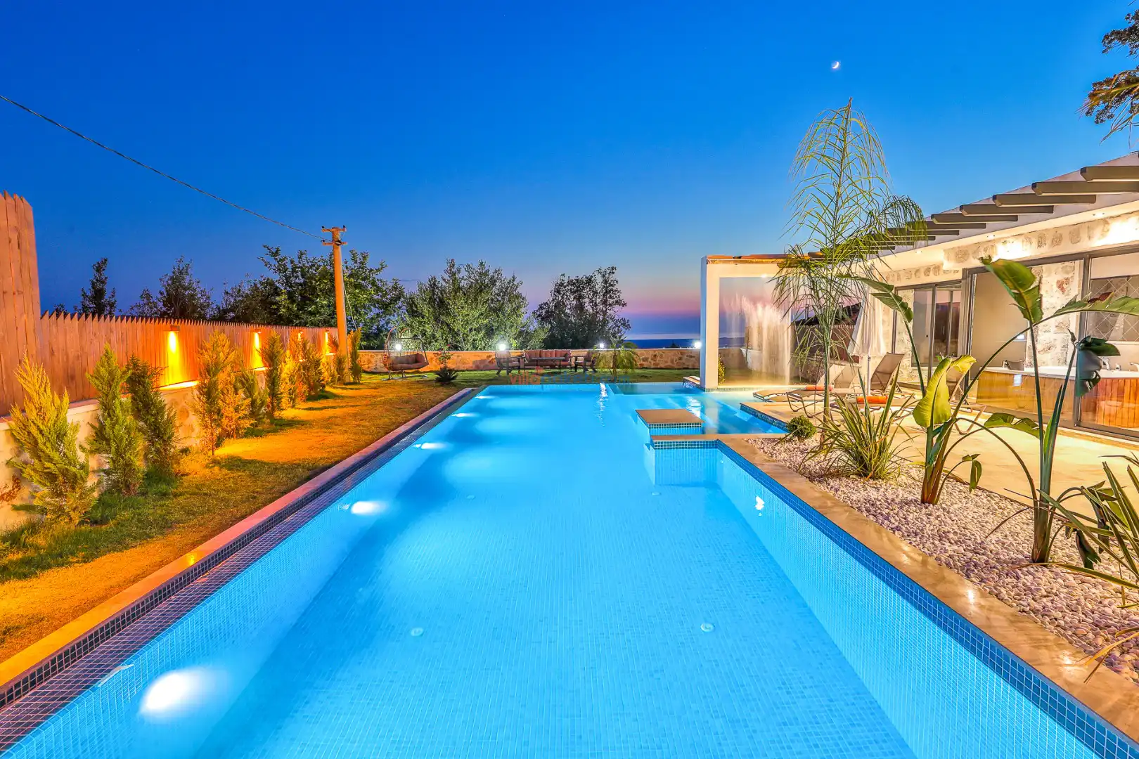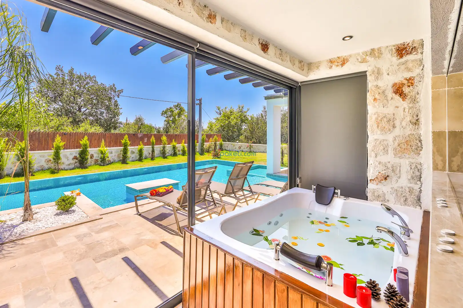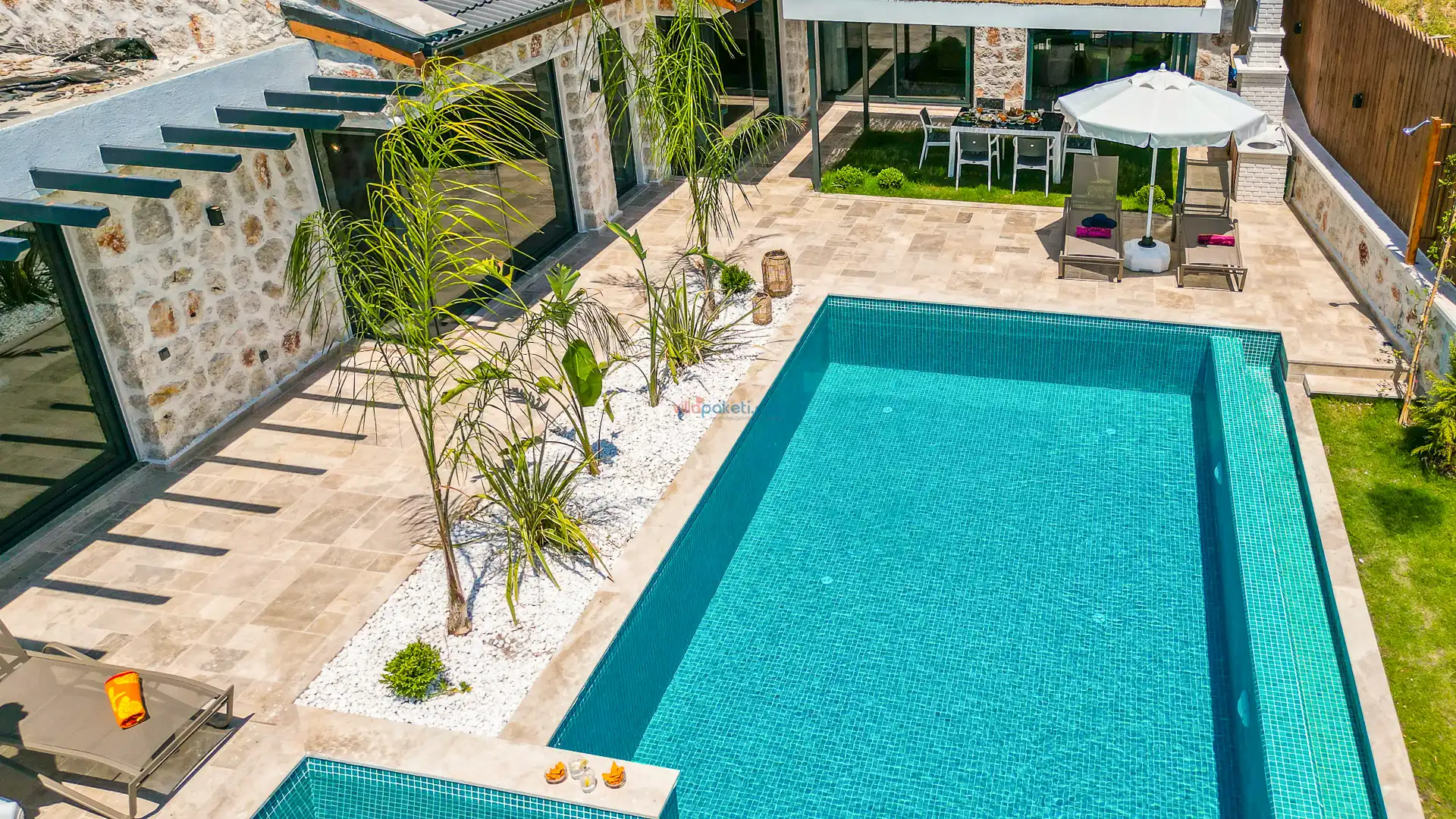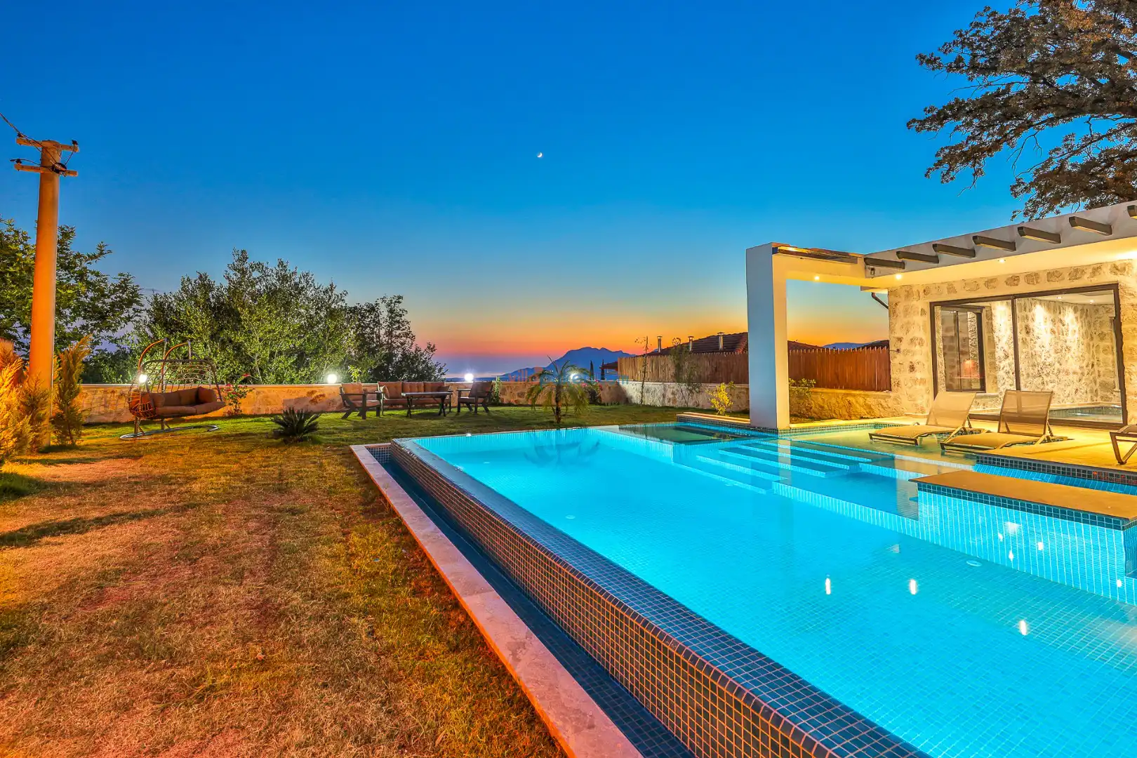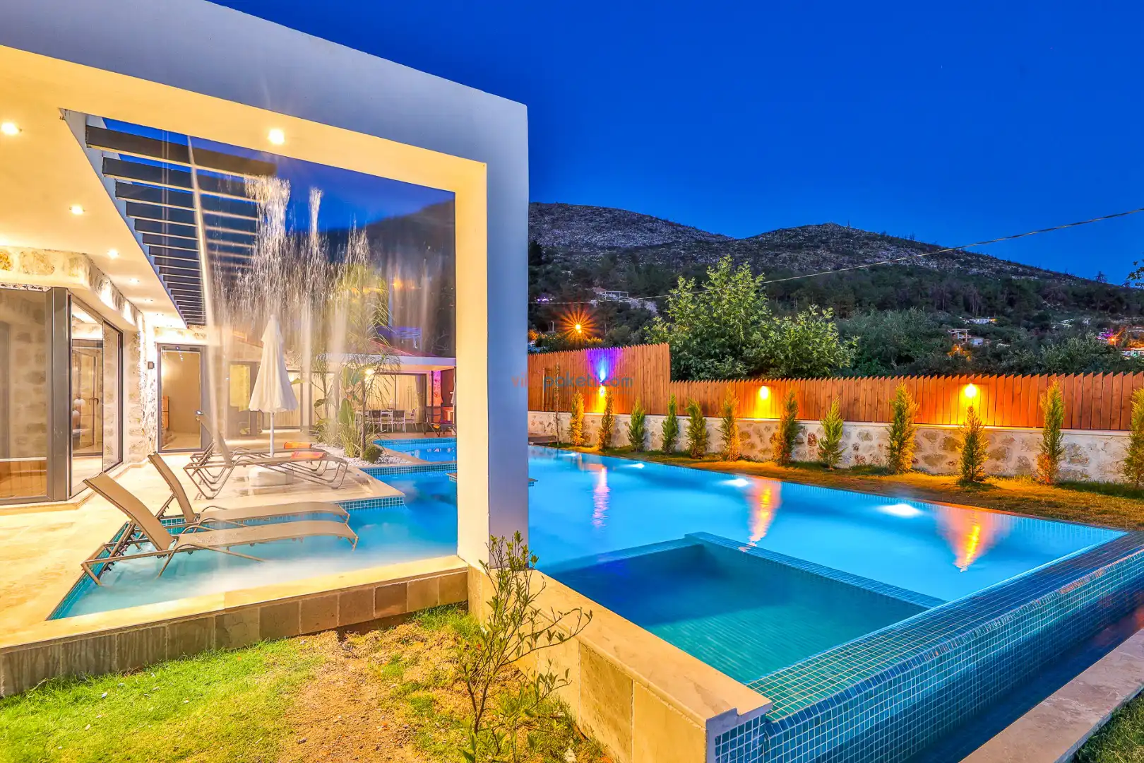 Villa Tan Üzümlü-Kalkan bölgesinde konumlanmış 3 yatak odalı ve 6 kişilik kapasitesiyle aileniz ve arkadaş grubunuz için ideal bir konaklama seçeneğidir. Bu lüks villa, tatiliniz boyunca tam konfor sağlar: hem açık hem kapalı ısıtmalı havuz, jakuzi, küvet, özel hamam ve sauna ile tüm yıl kullanıma uygun bir tatil imkanı sunar. Doğa ile iç içe, tamamen korunaklı yapısı sayesinde muhafazakâr aileler ve balayı çiftleri için güvenli ve mahrem bir tatil deneyimi sağlar. Modern dekorasyonu, yüksek kaliteli mobilyaları ve özenle tasarlanmış odalarıyla Villa Tan , lüks ve konforu bir araya getirir. Kalkan Üzümlü bölgesinin sakin atmosferinde, doğa ve deniz yakınlığıyla unutulmaz anılar biriktireceğiniz bu villa, tatilinizi ayrıcalıklı bir deneyime dönüştürmek için sizi bekliyor.