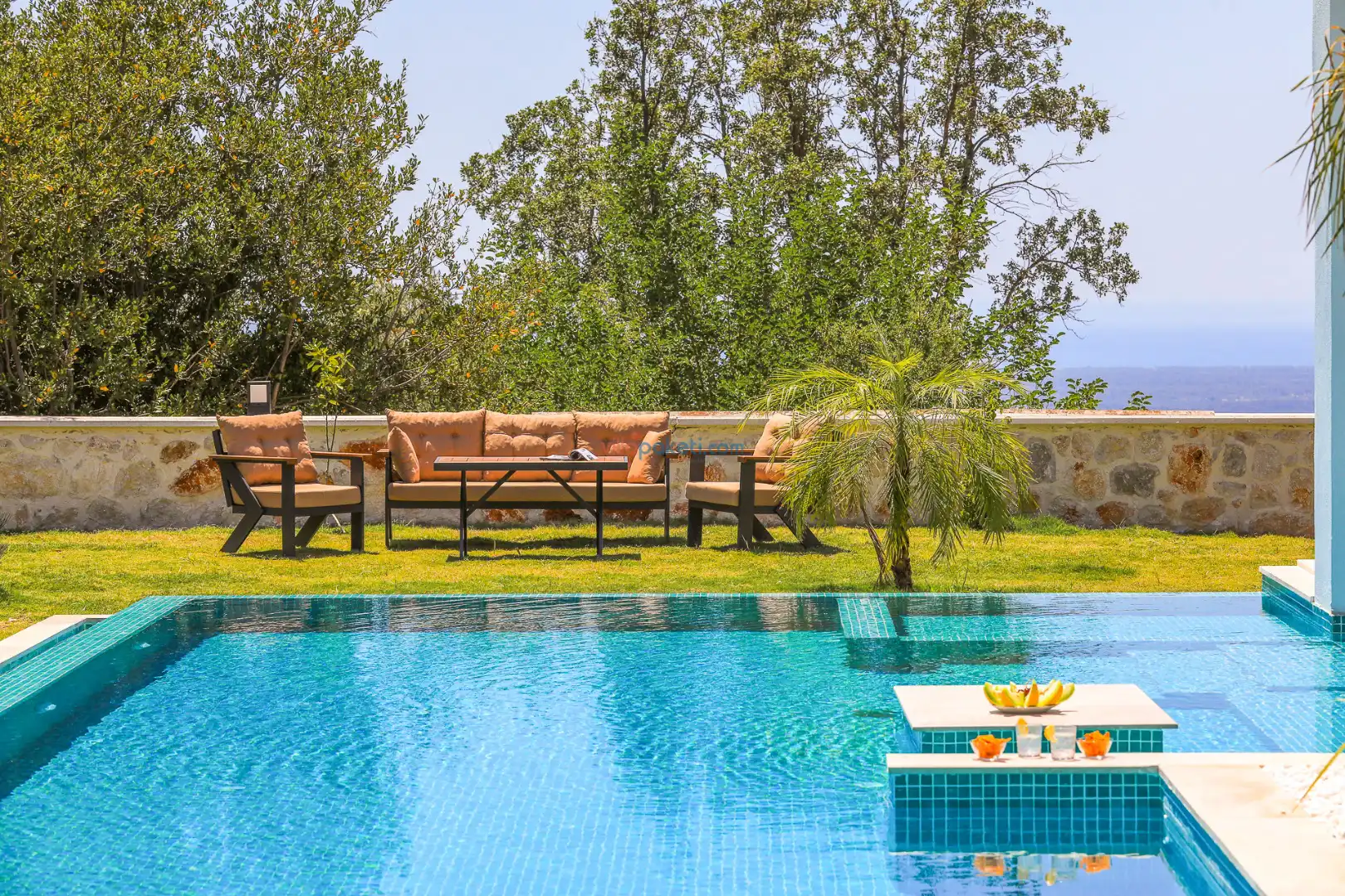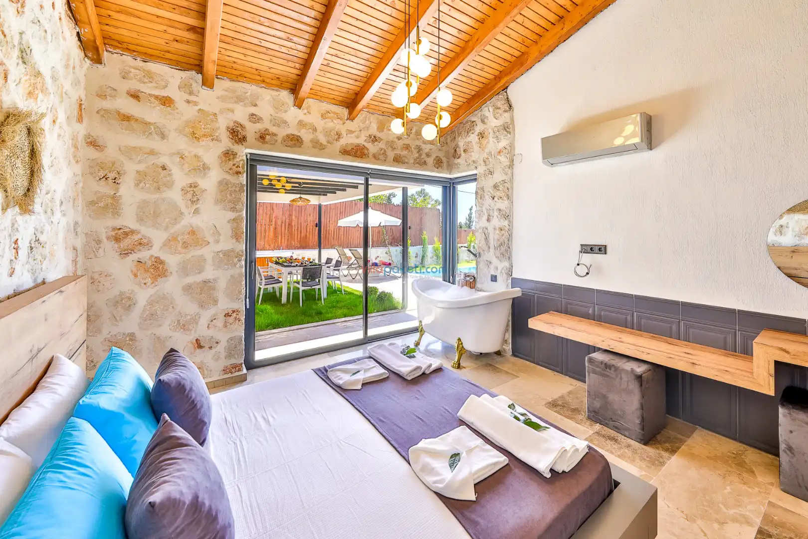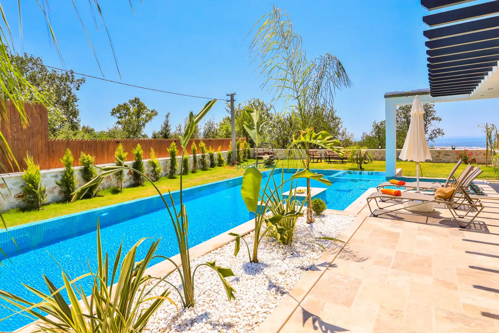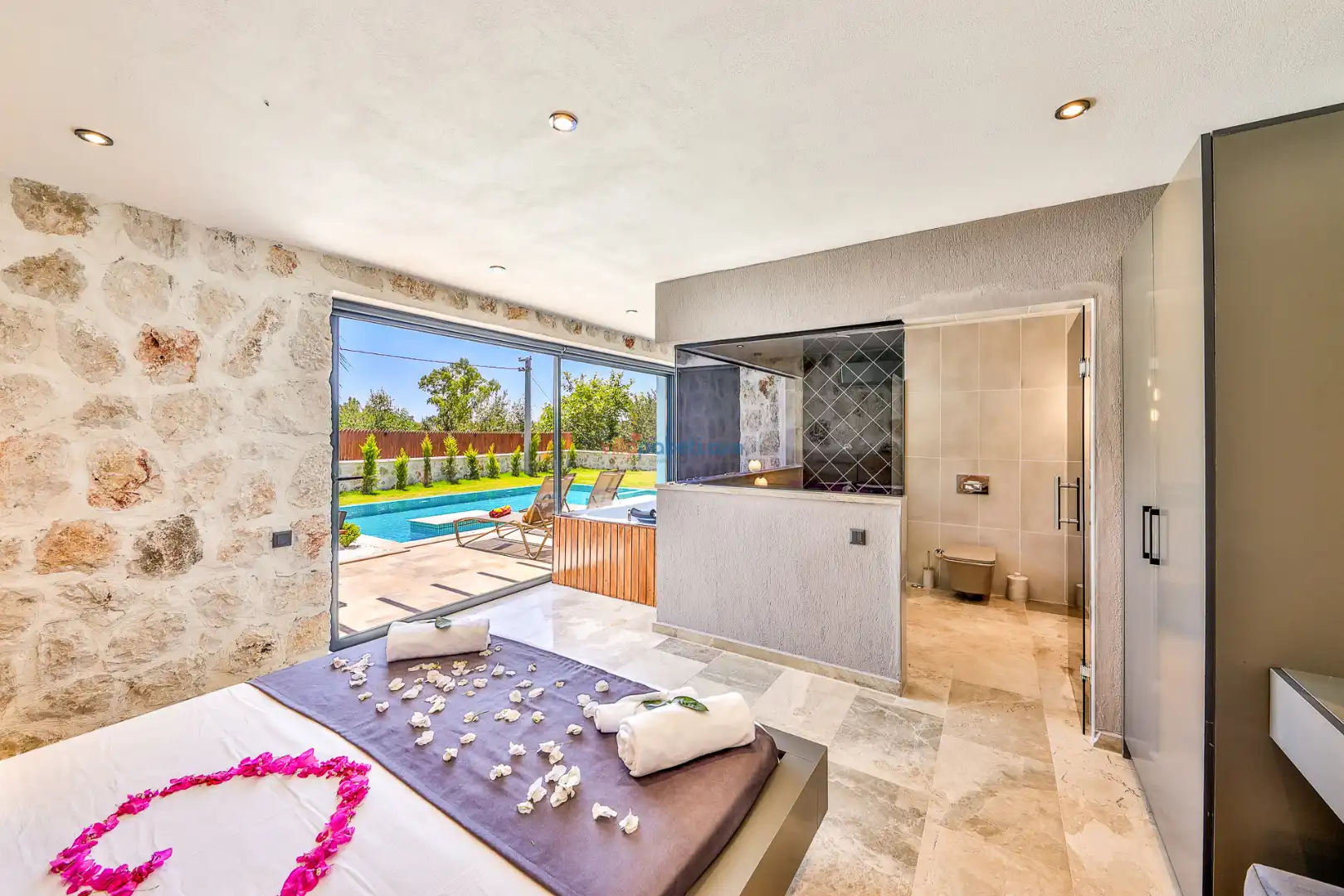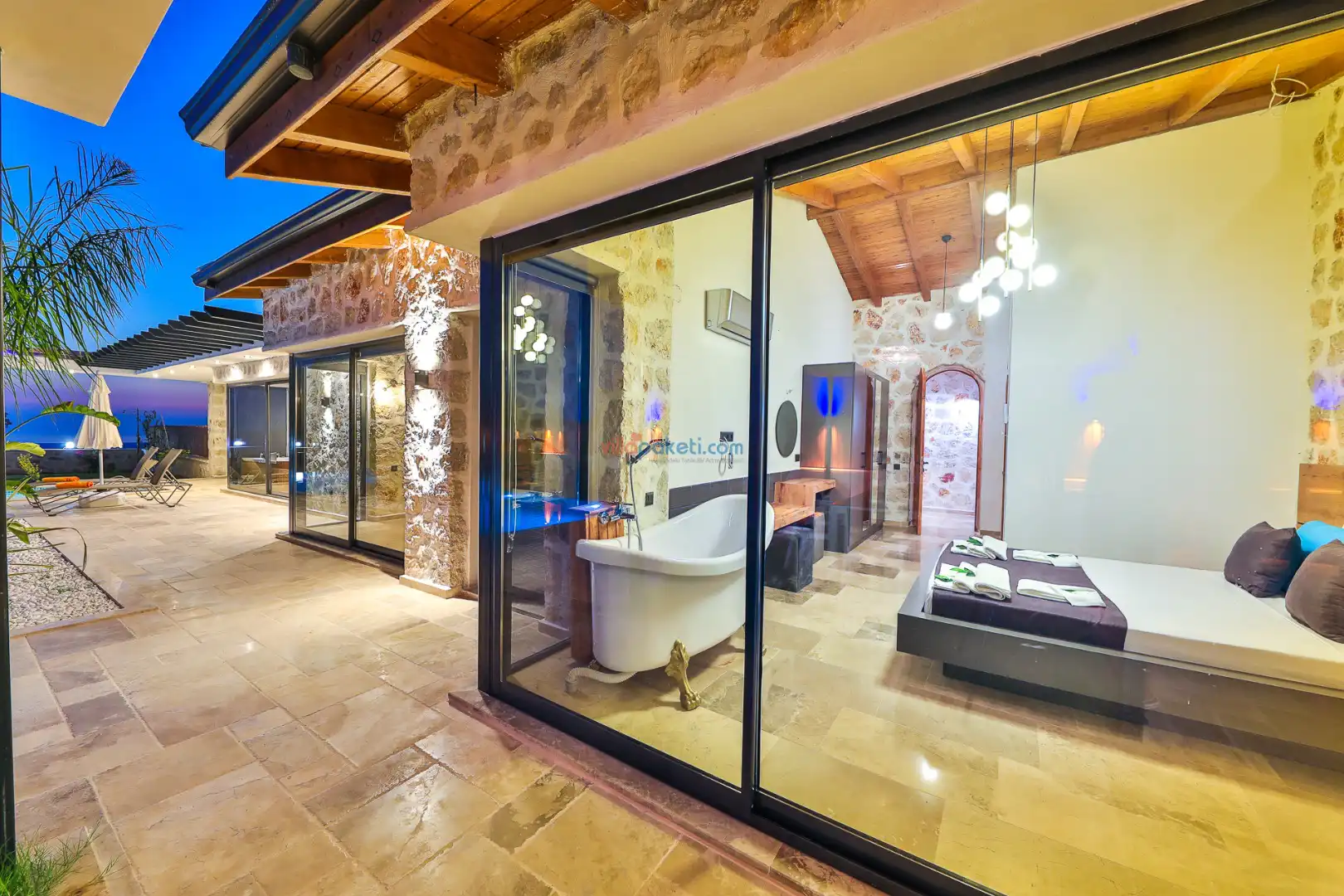Villa Tan Üzümlü-Kalkan bölgesinde konumlanmış 3 yatak odalı ve 6 kişilik kapasitesiyle aileniz ve arkadaş grubunuz için ideal bir konaklama seçeneğidir. Bu lüks villa, tatiliniz boyunca tam konfor sağlar: hem açık hem kapalı ısıtmalı havuz, jakuzi, küvet, özel hamam ve sauna ile tüm yıl kullanıma uygun bir tatil imkanı sunar. Doğa ile iç içe, tamamen korunaklı yapısı sayesinde muhafazakâr aileler ve balayı çiftleri için güvenli ve mahrem bir tatil deneyimi sağlar. Modern dekorasyonu, yüksek kaliteli mobilyaları ve özenle tasarlanmış odalarıyla Villa Tan , lüks ve konforu bir araya getirir. Kalkan Üzümlü bölgesinin sakin atmosferinde, doğa ve deniz yakınlığıyla unutulmaz anılar biriktireceğiniz bu villa, tatilinizi ayrıcalıklı bir deneyime dönüştürmek için sizi bekliyor.