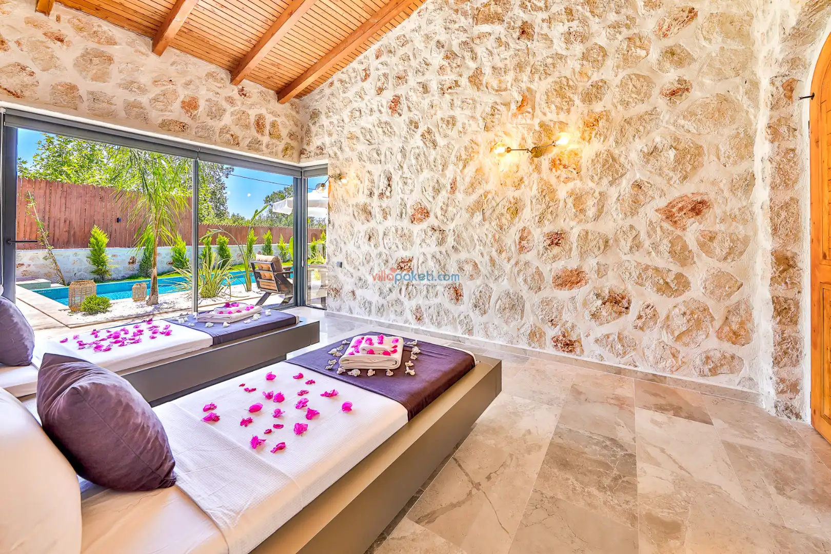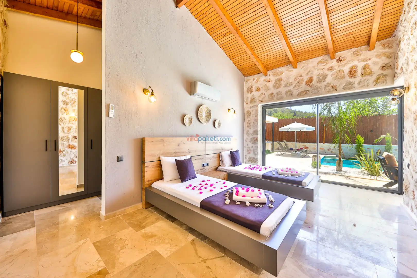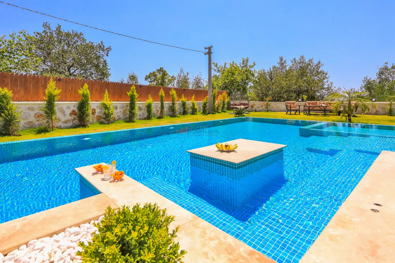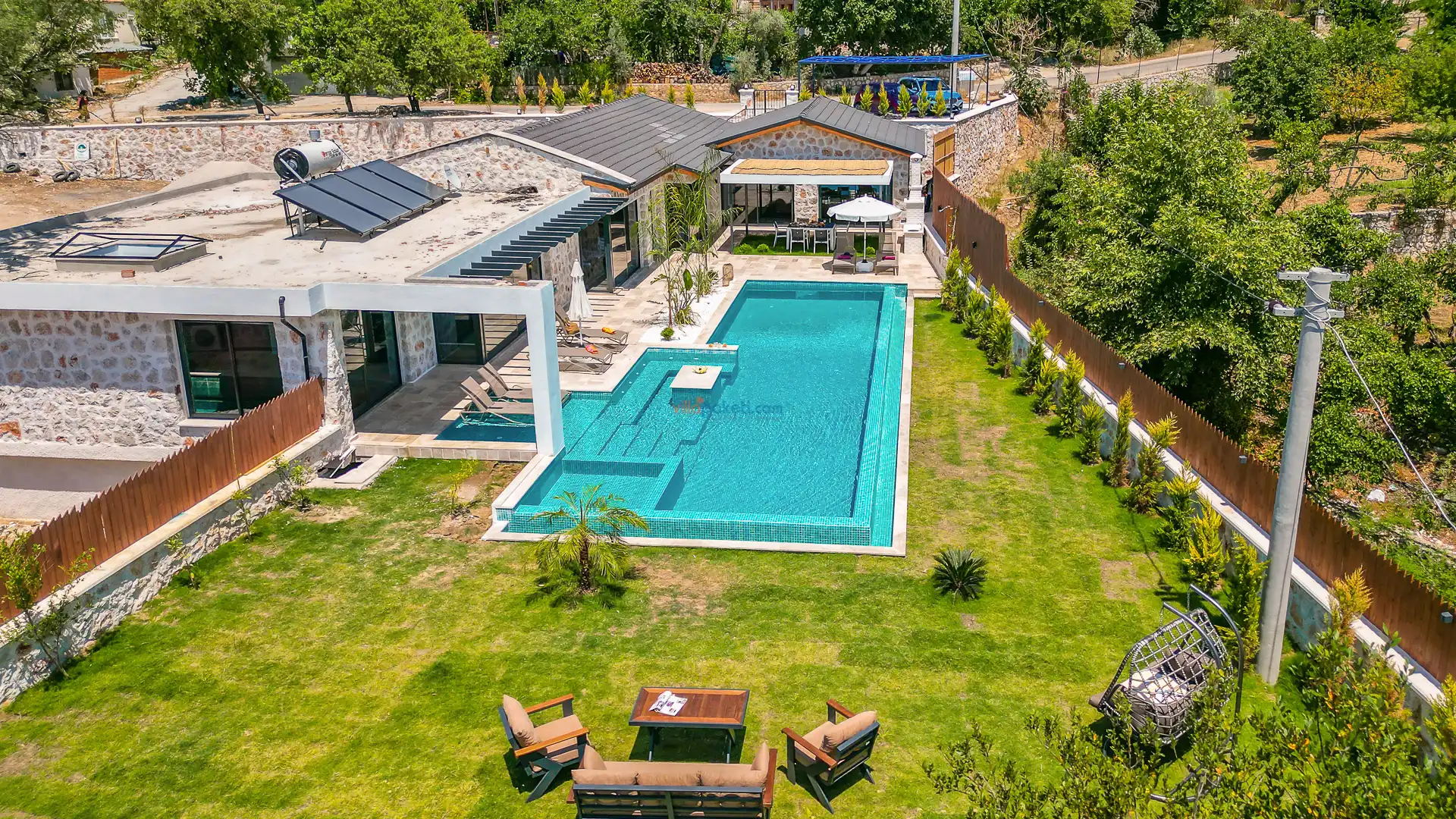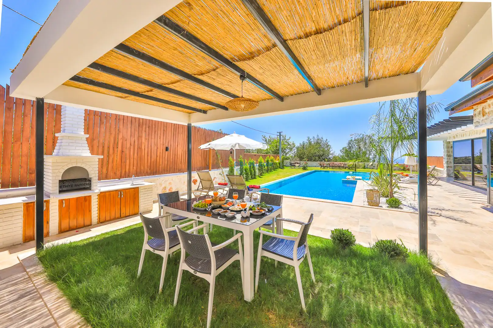 Villa Tan Üzümlü-Kalkan bölgesinde konumlanmış 3 yatak odalı ve 6 kişilik kapasitesiyle aileniz ve arkadaş grubunuz için ideal bir konaklama seçeneğidir. Bu lüks villa, tatiliniz boyunca tam konfor sağlar: hem açık hem kapalı ısıtmalı havuz, jakuzi, küvet, özel hamam ve sauna ile tüm yıl kullanıma uygun bir tatil imkanı sunar. Doğa ile iç içe, tamamen korunaklı yapısı sayesinde muhafazakâr aileler ve balayı çiftleri için güvenli ve mahrem bir tatil deneyimi sağlar. Modern dekorasyonu, yüksek kaliteli mobilyaları ve özenle tasarlanmış odalarıyla Villa Tan , lüks ve konforu bir araya getirir. Kalkan Üzümlü bölgesinin sakin atmosferinde, doğa ve deniz yakınlığıyla unutulmaz anılar biriktireceğiniz bu villa, tatilinizi ayrıcalıklı bir deneyime dönüştürmek için sizi bekliyor.